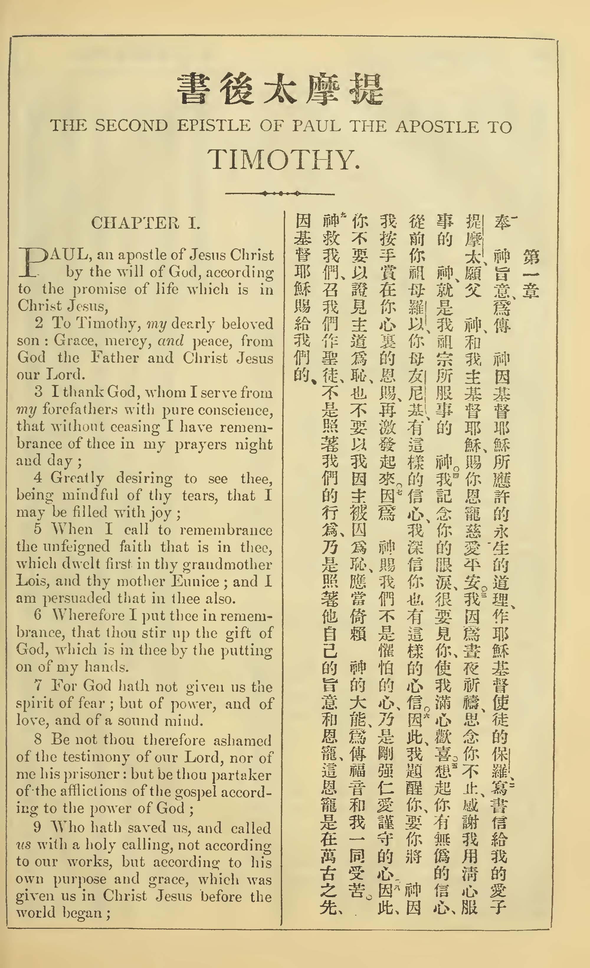 1902年新约全书(中英对照) 提摩太后书 1 章 1 节到 1 章 9 节