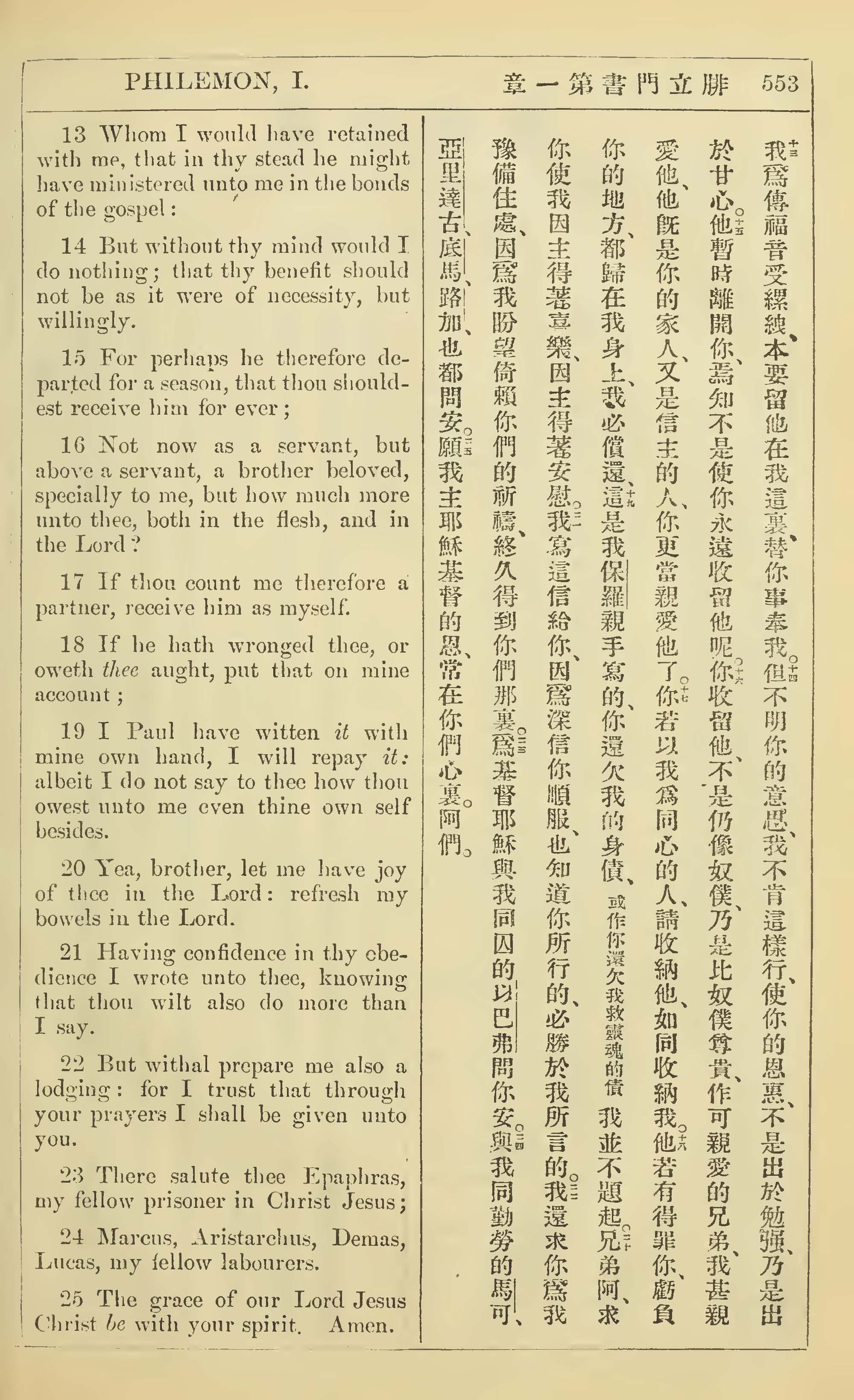 1902年新约全书(中英对照) 腓利门书 1 章 13 节到 1 章 25 节