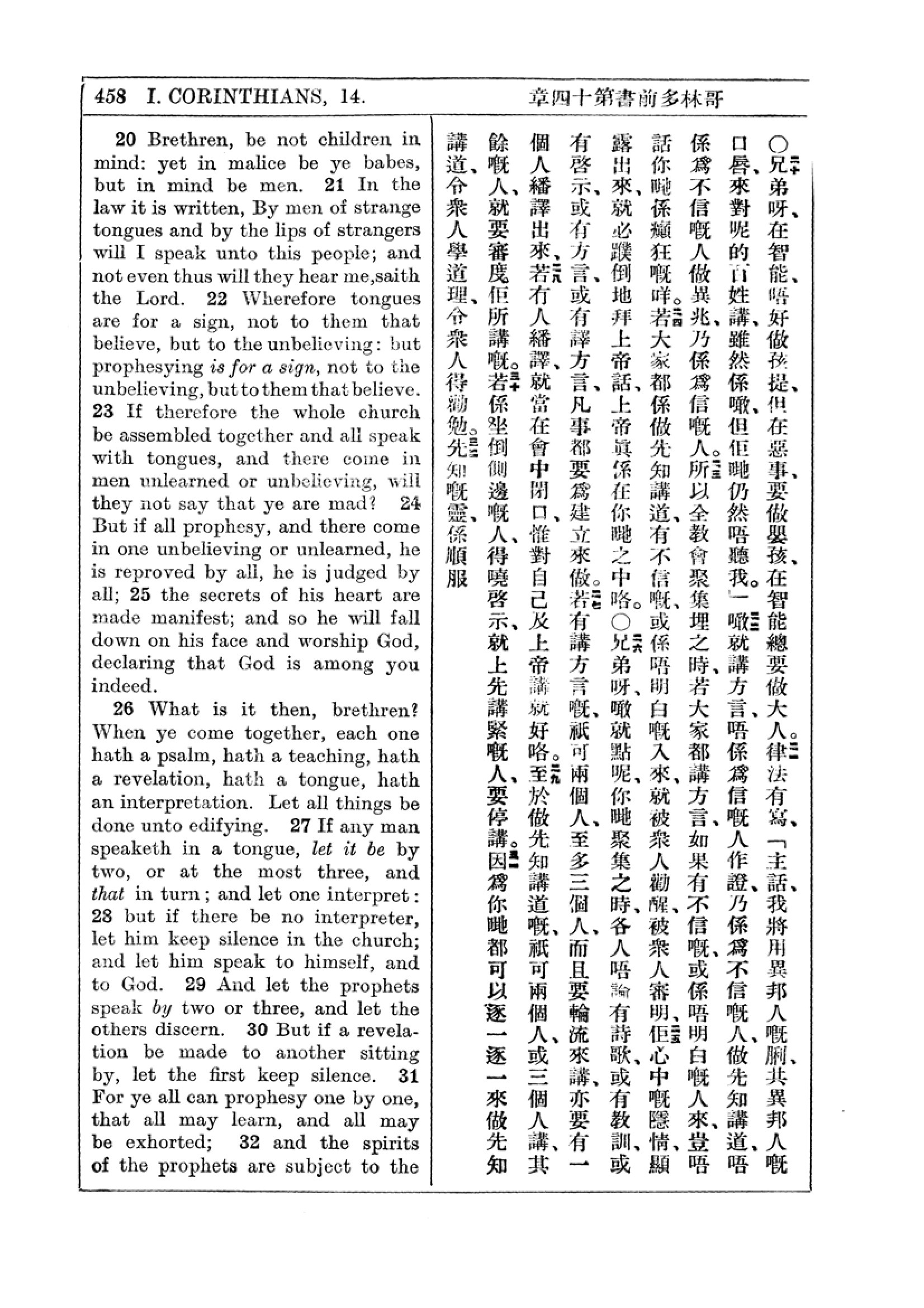 1927年新约全书(中英对照) 哥林多前书 14 章 20 节到 14 章 32 节
