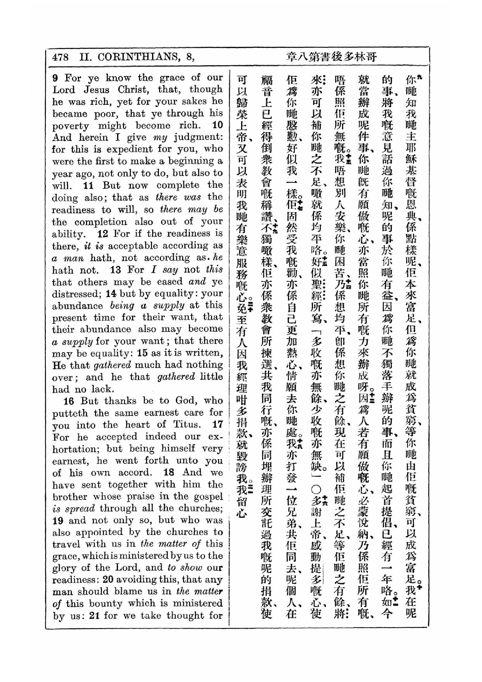 1927年新约全书(中英对照) 哥林多后书 8 章 9 节到 8 章 21 节