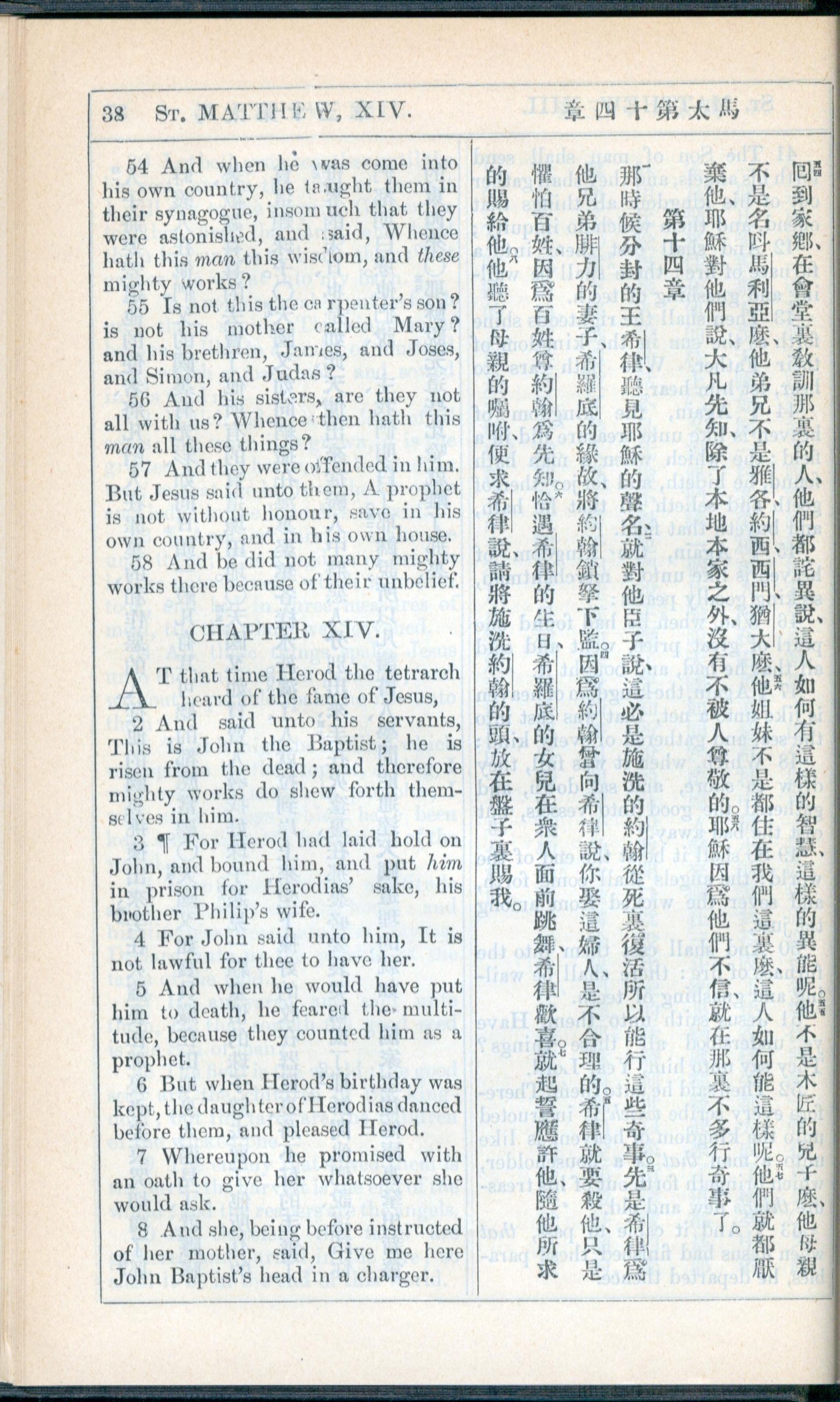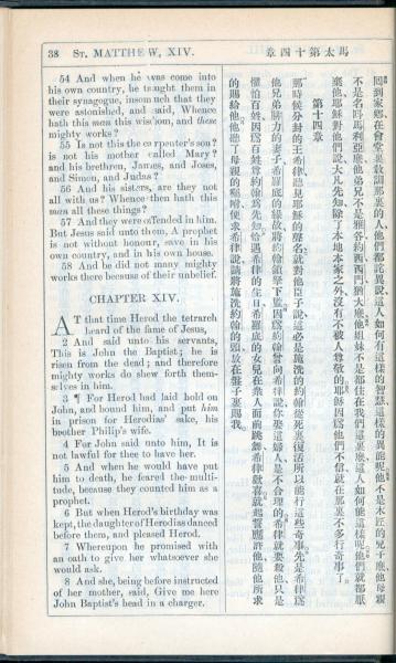 1908年新约全书(中西字) 马太福音 13 章 54 节到 14 章 8 节
