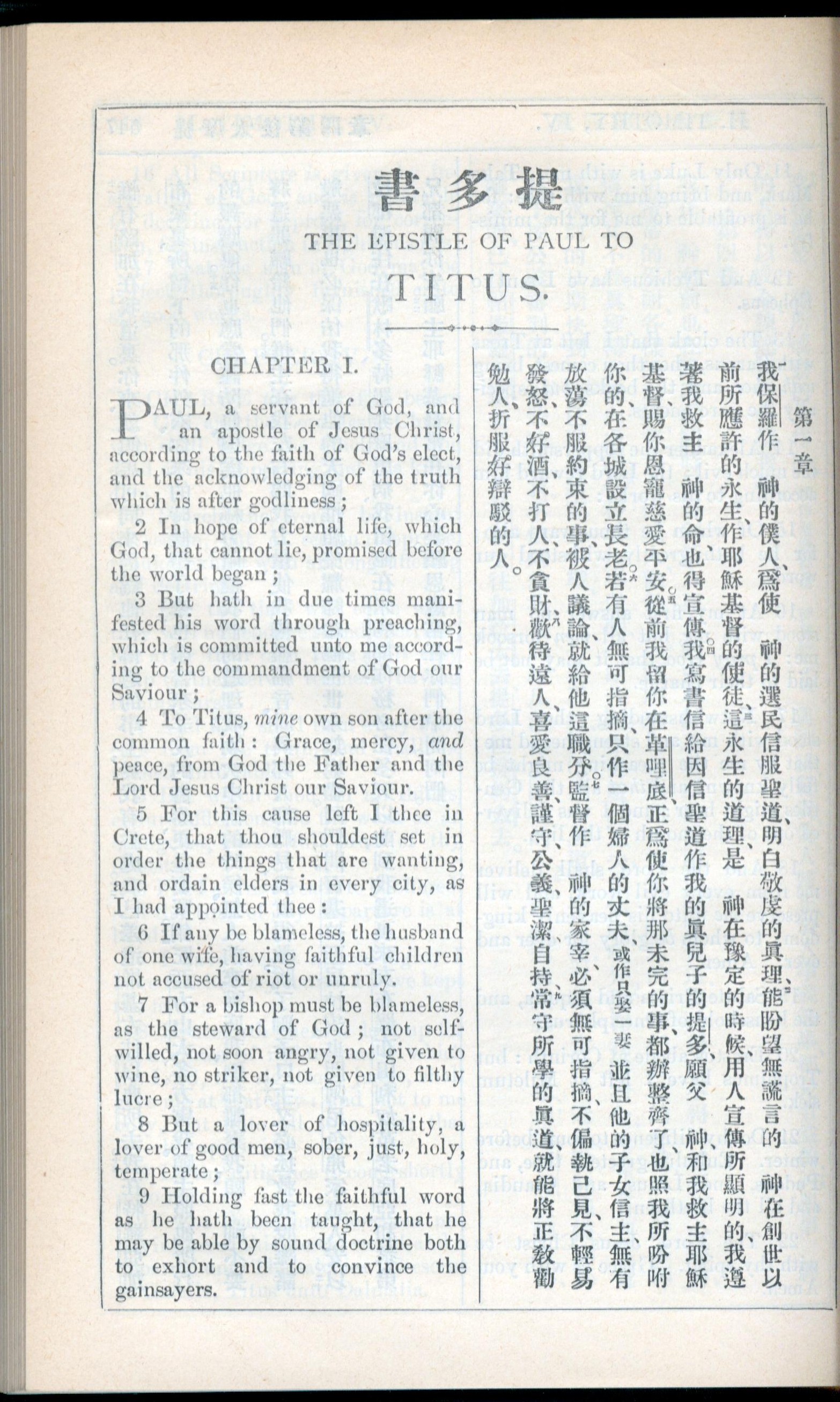 1908年新约全书(中西字) 提多书 1 章 1 节到 1 章 9 节