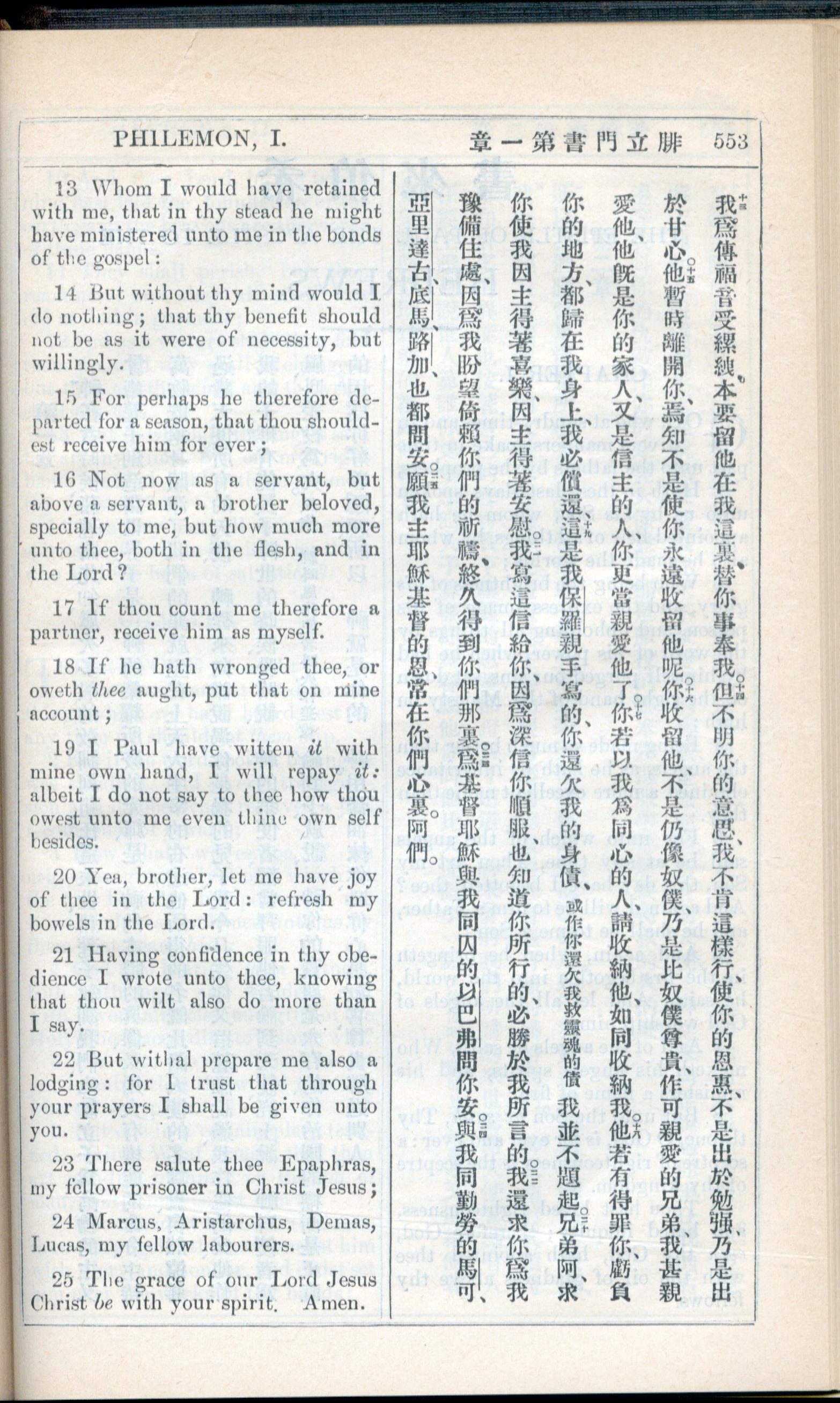 1908年新约全书(中西字) 腓利门书 1 章 13 节到 1 章 25 节