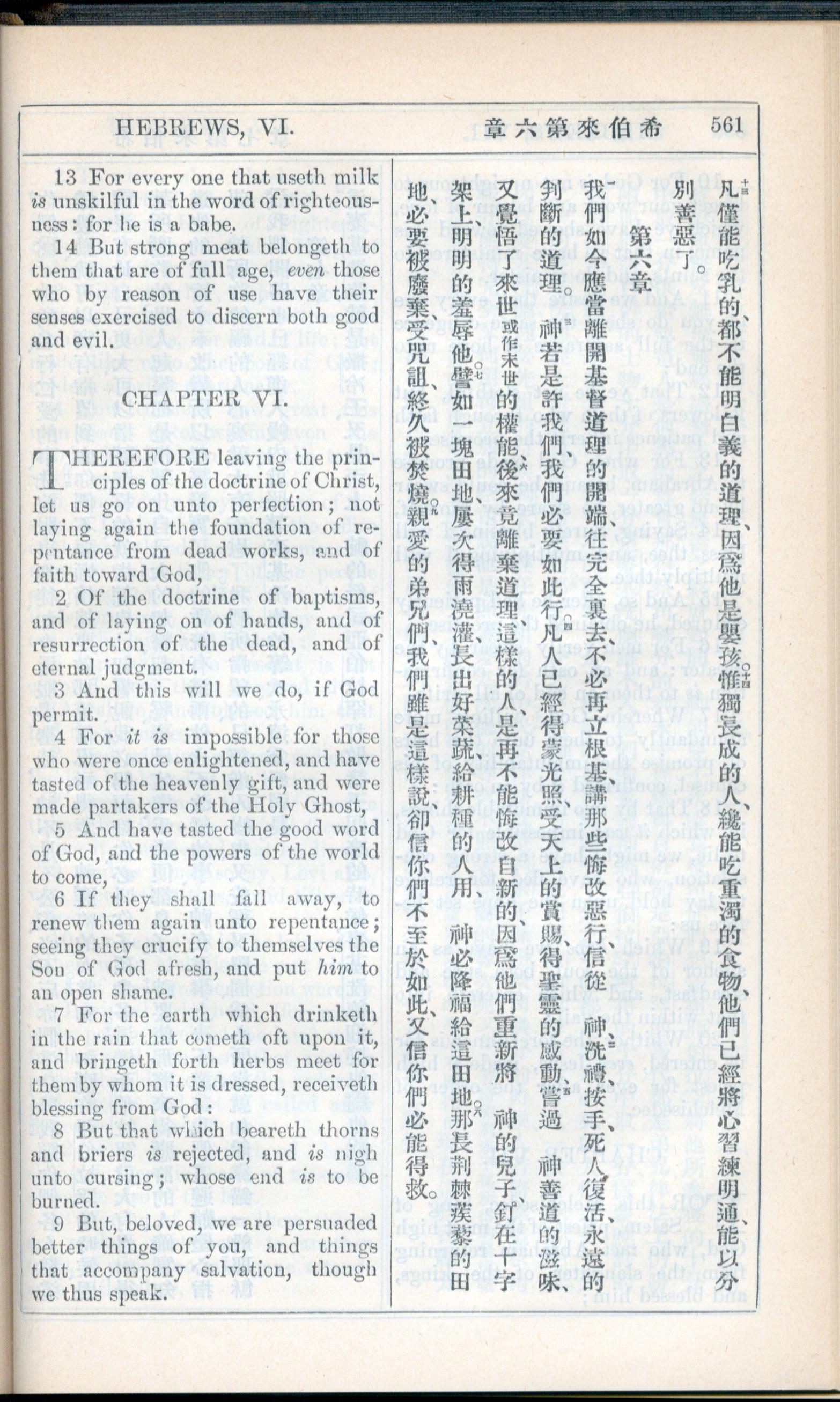 1908年新约全书(中西字) 希伯来书 5 章 13 节到 6 章 9 节