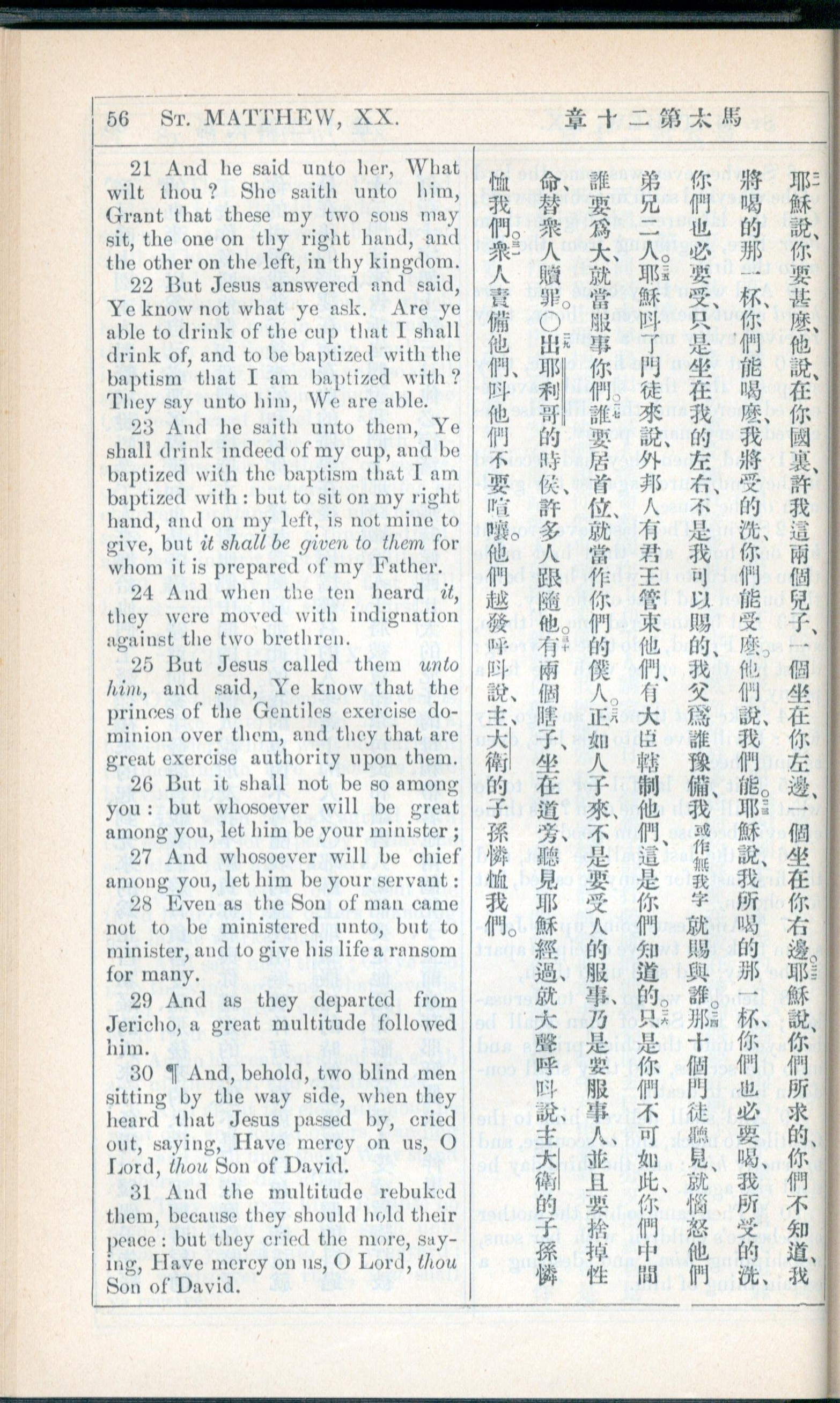 1908年新约全书(中西字) 马太福音 20 章 21 节到 20 章 31 节
