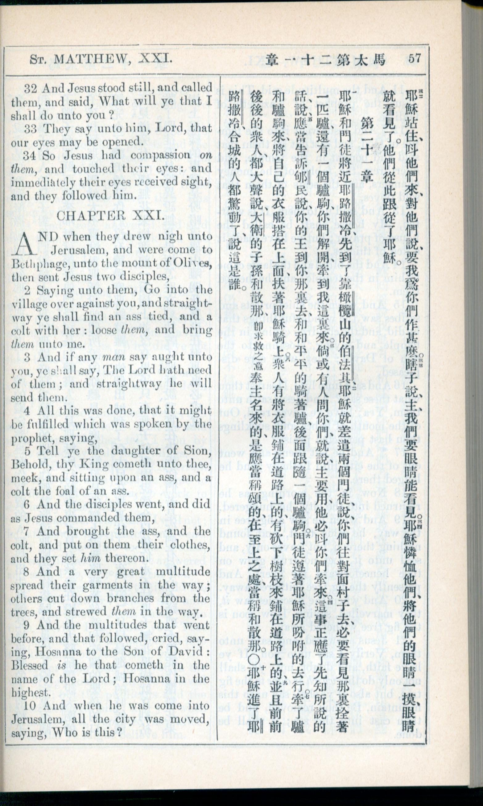1908年新约全书(中西字) 马太福音 20 章 32 节到 21 章 10 节