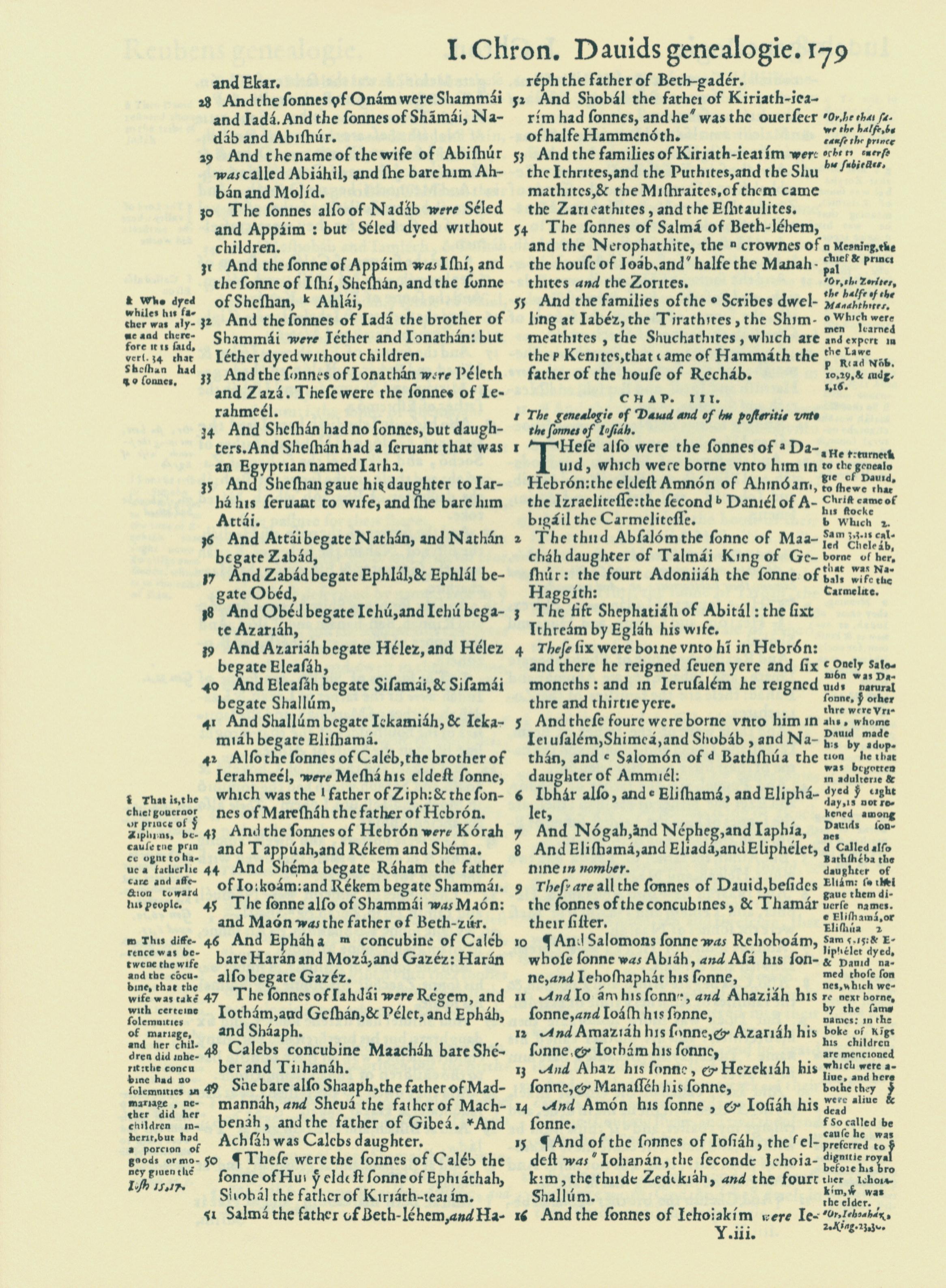 1560年THE BIBLE AND HOLY SCRIPTURES 历代志上 2 章 28 节到 3 章 16 节