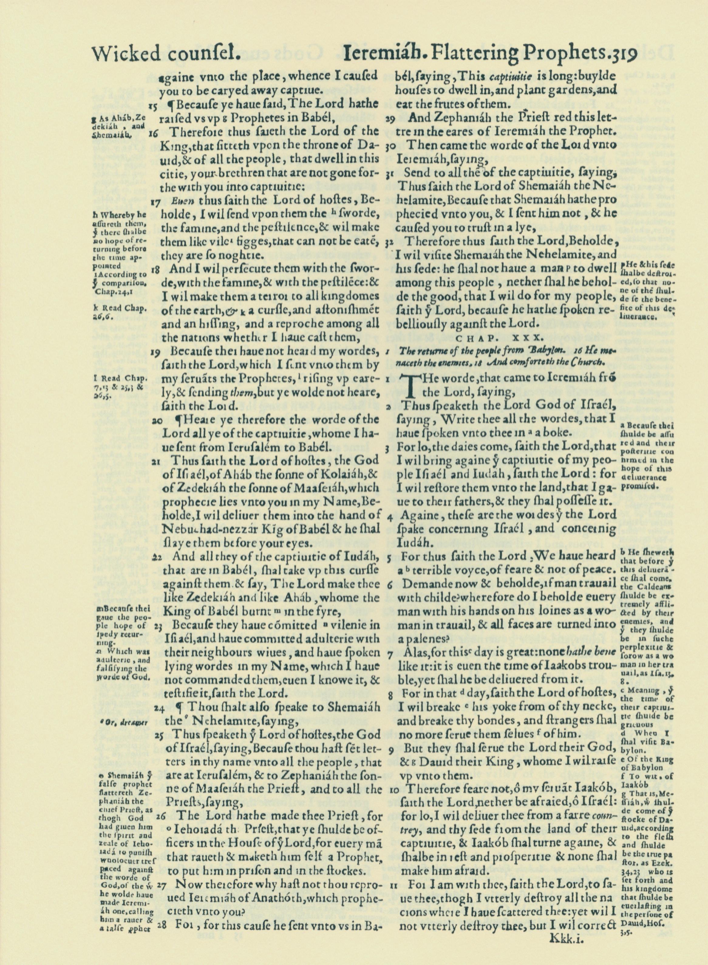 1560年THE BIBLE AND HOLY SCRIPTURES 耶利米书 29 章 15 节到 30 章 11 节