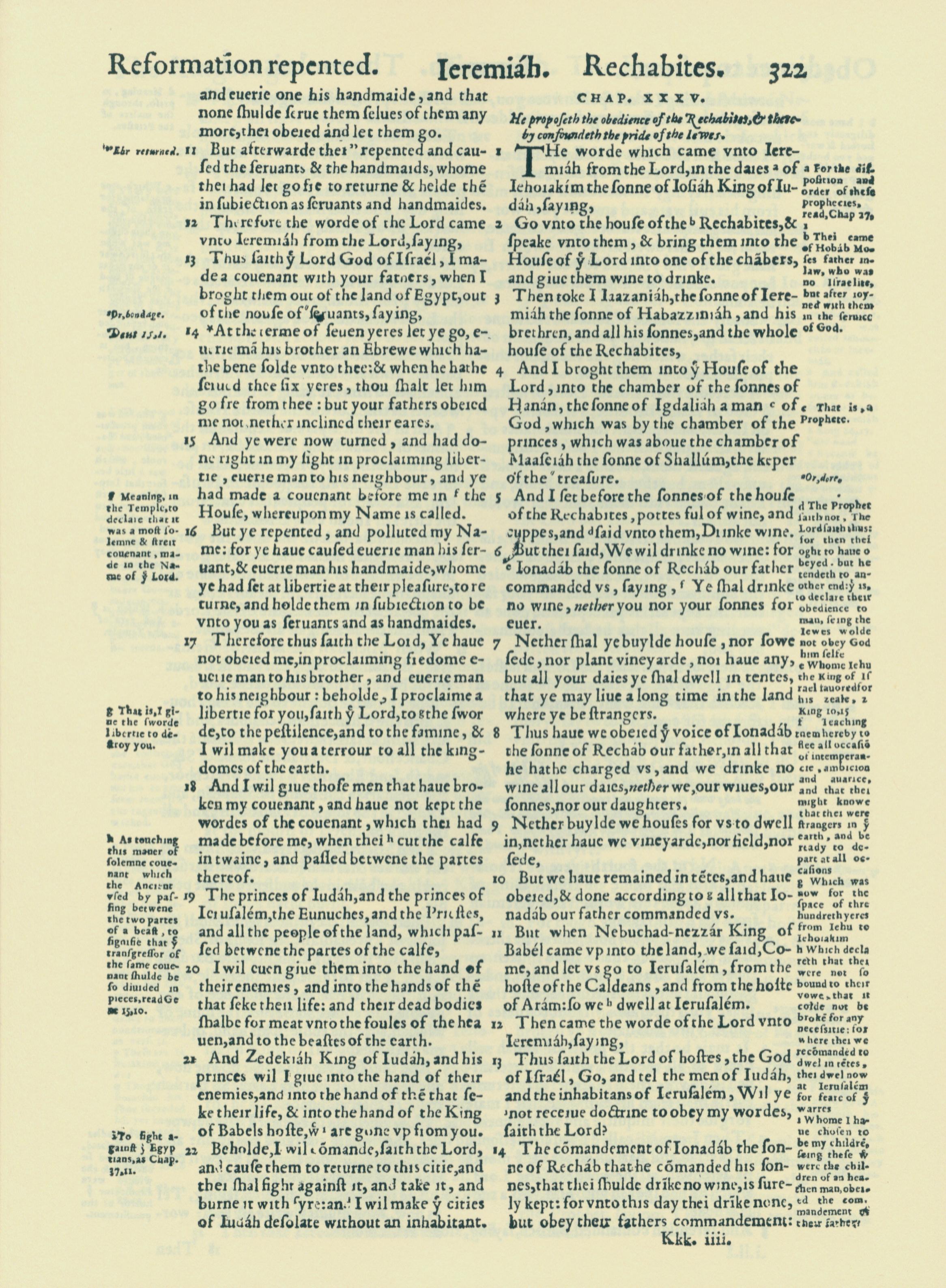 1560年THE BIBLE AND HOLY SCRIPTURES 耶利米书 34 章 11 节到 35 章 14 节