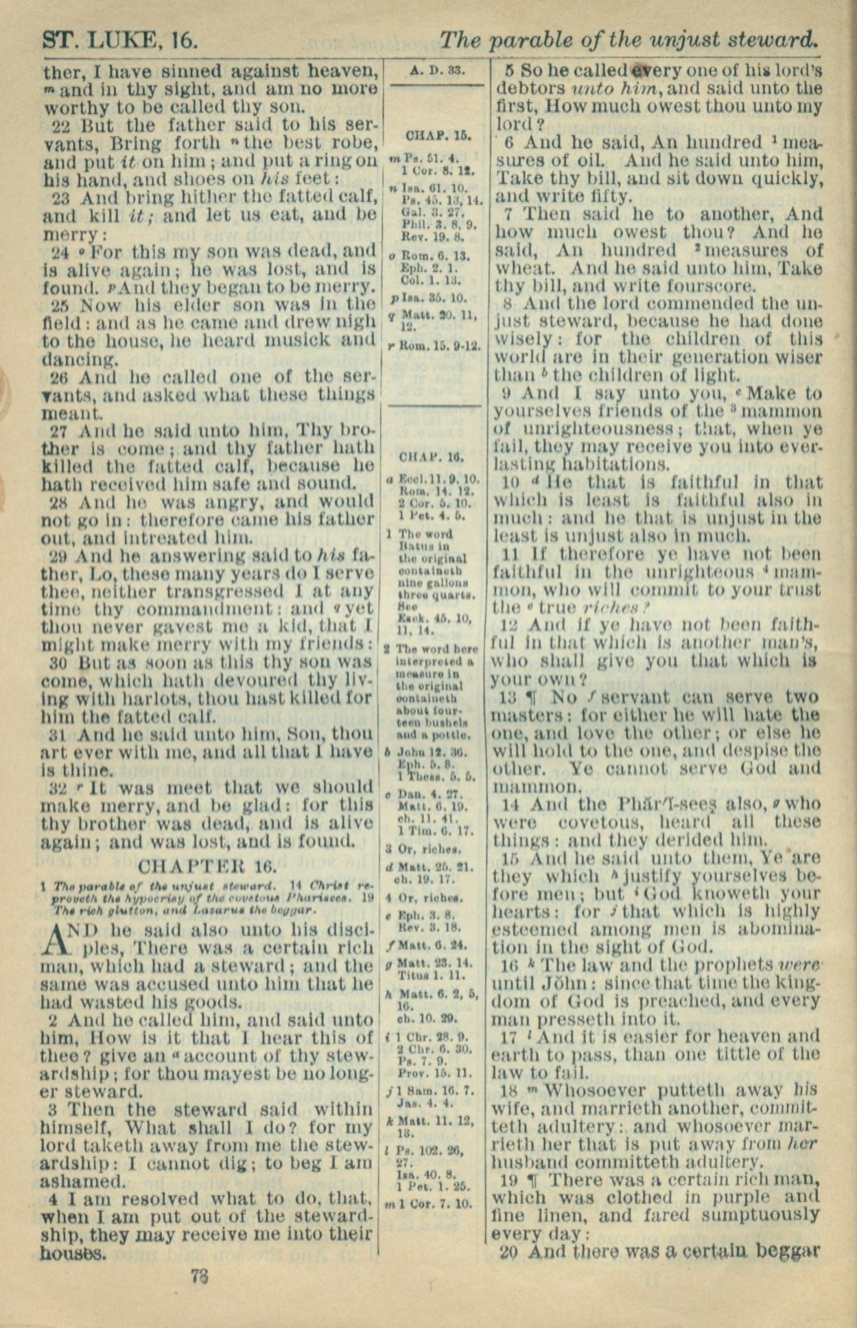 1916年Holy Bible 路加福音 15 章 22 节到 16 章 20 节
