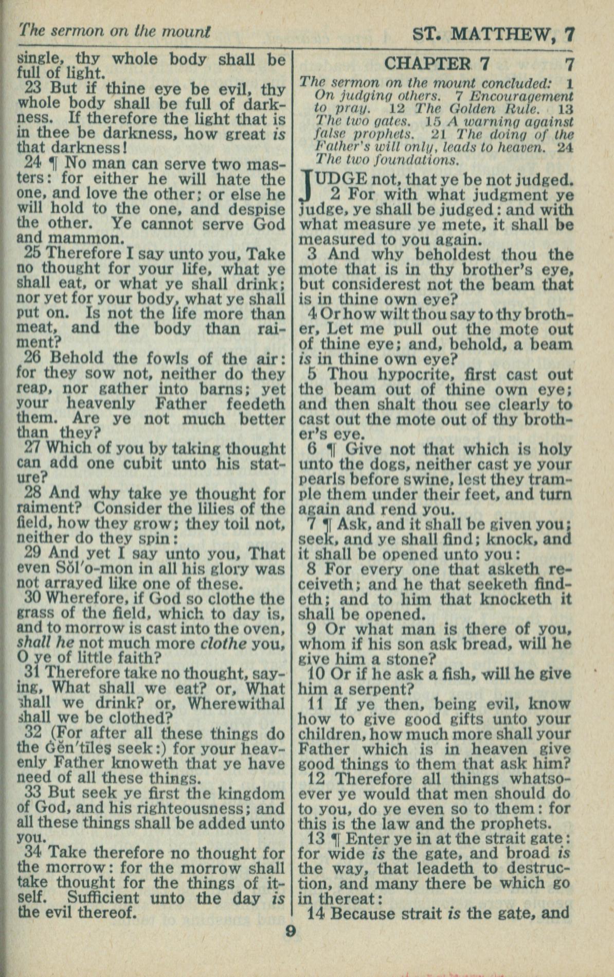 1946年King James Version 马太福音 6 章 23 节到 7 章 14 节