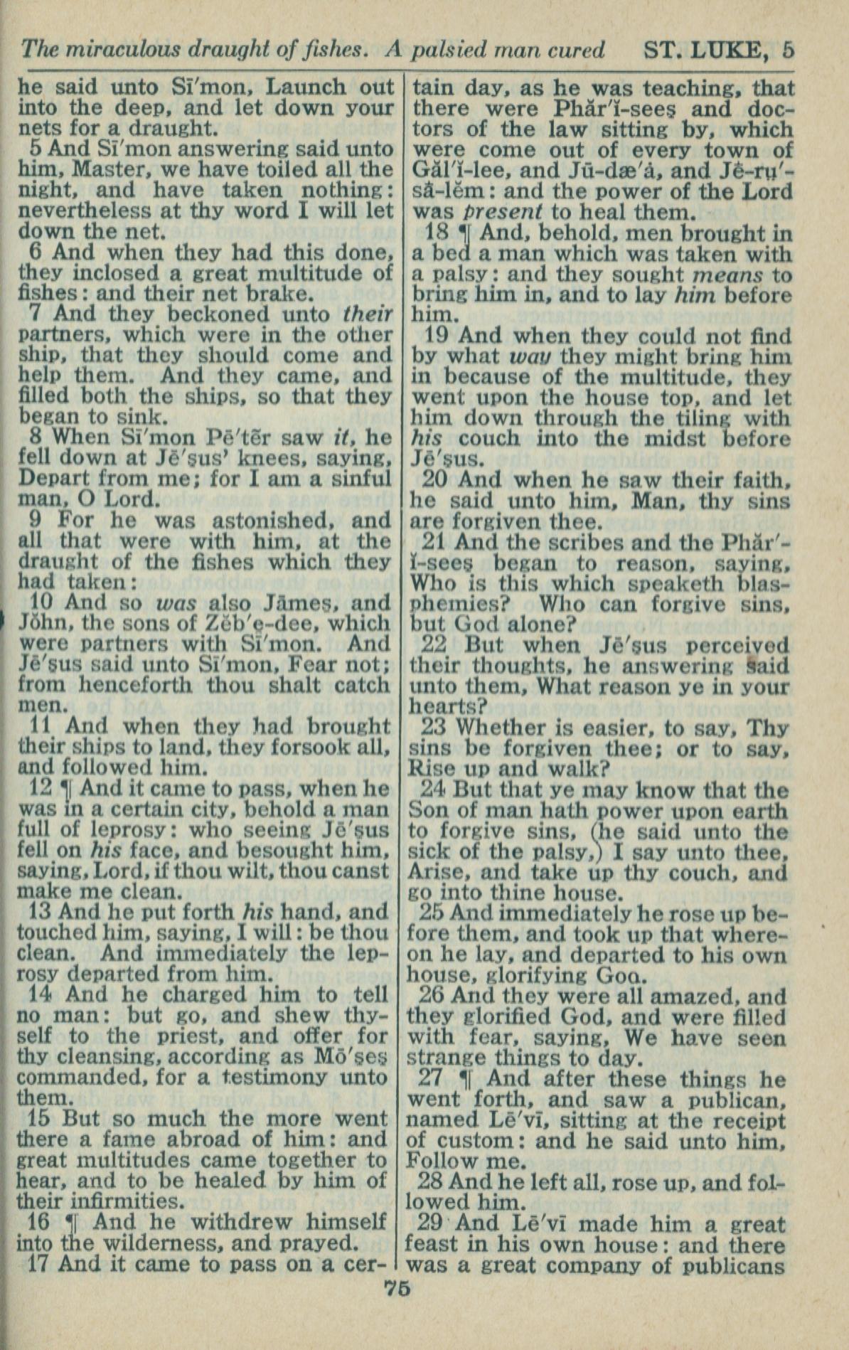 1946年King James Version 路加福音 5 章 5 节到 5 章 29 节