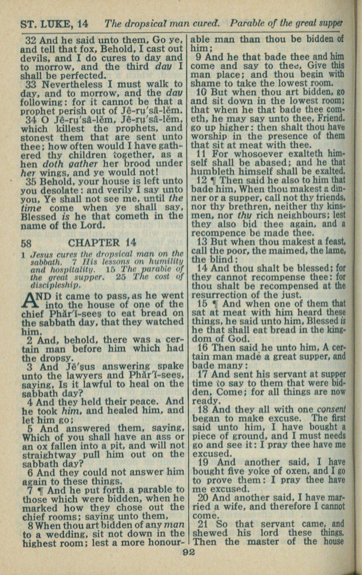 1946年King James Version 路加福音 13 章 32 节到 14 章 21 节