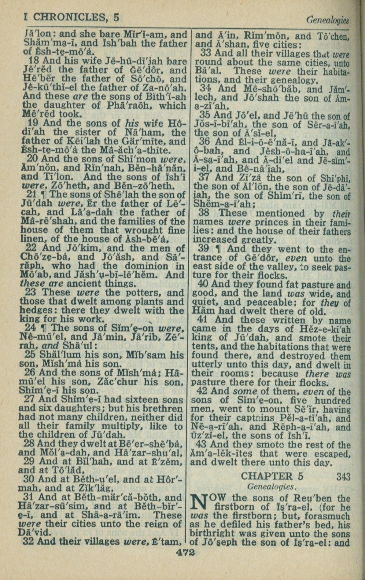 1946年King James Version 历代志上 4 章 18 节到 5 章 1 节