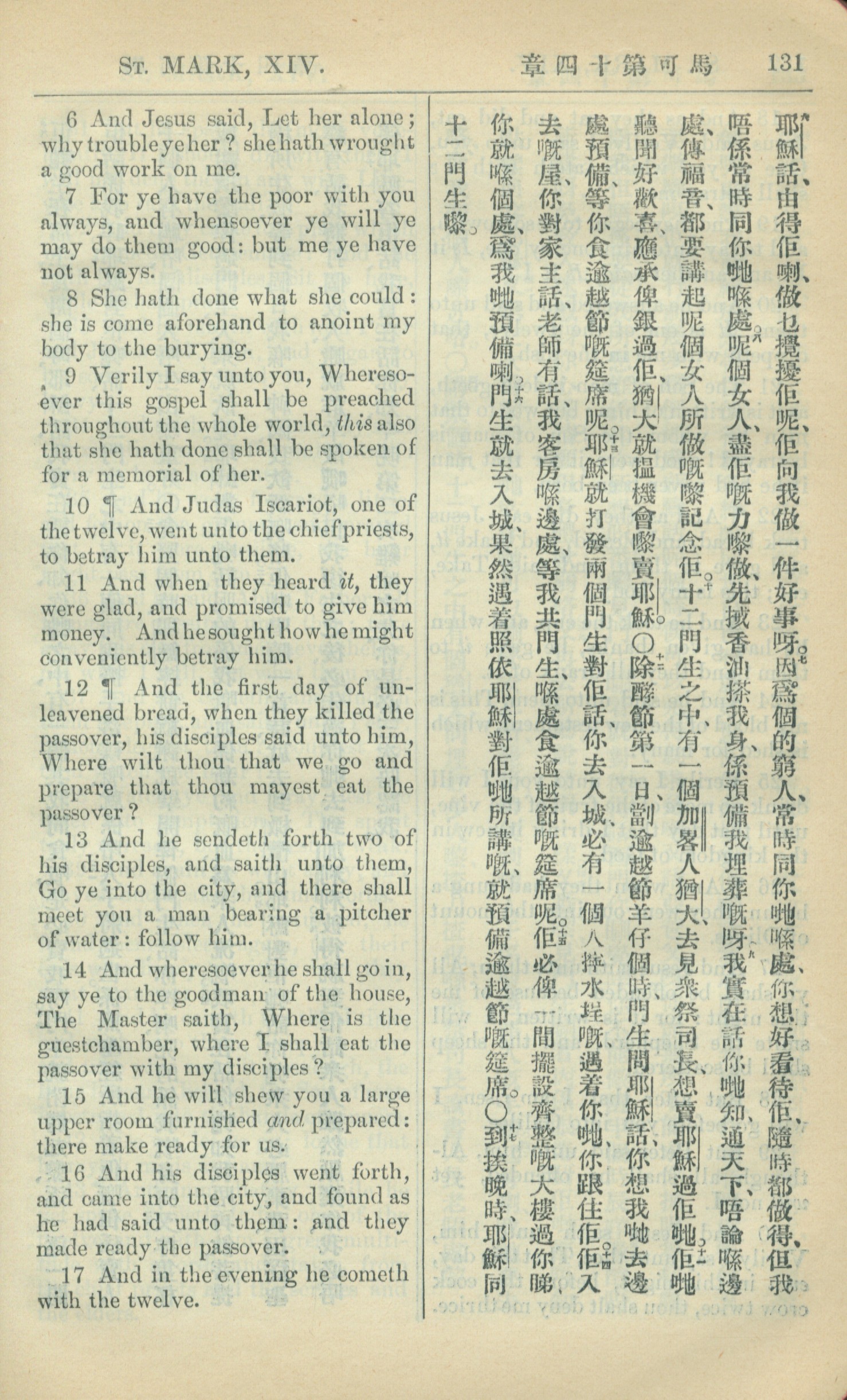1909年中西字新约全书 马可福音 14 章 6 节到 14 章 17 节