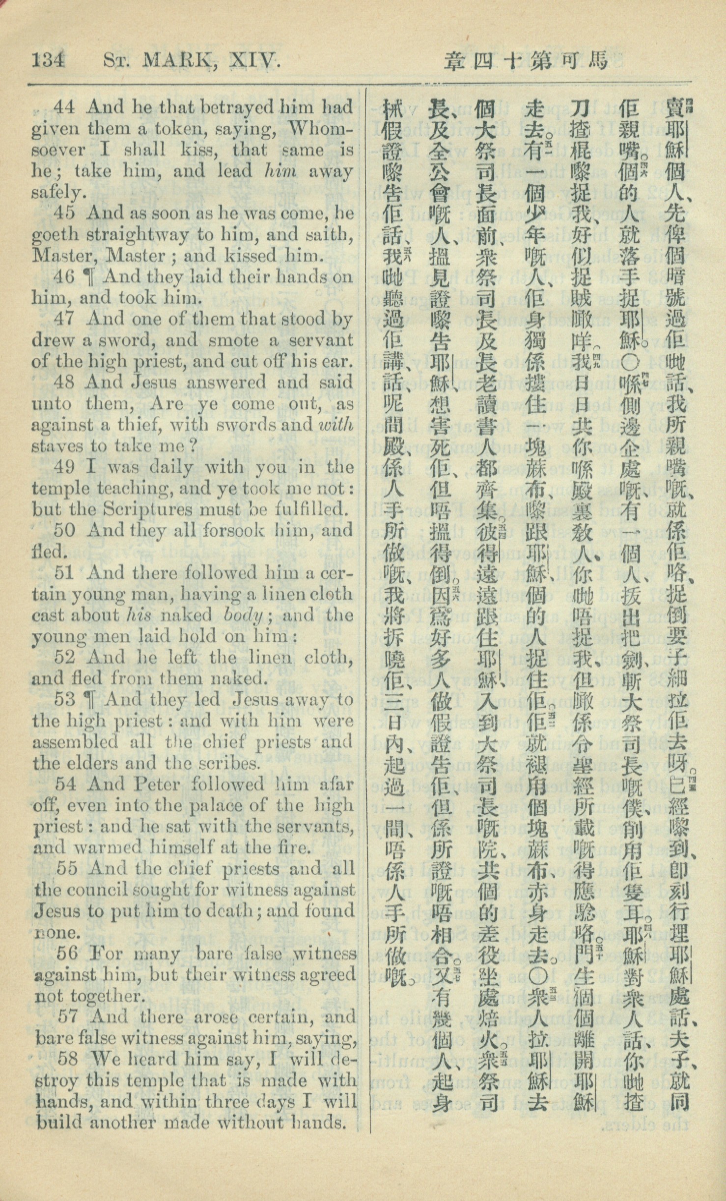 1909年中西字新约全书 马可福音 14 章 44 节到 14 章 58 节