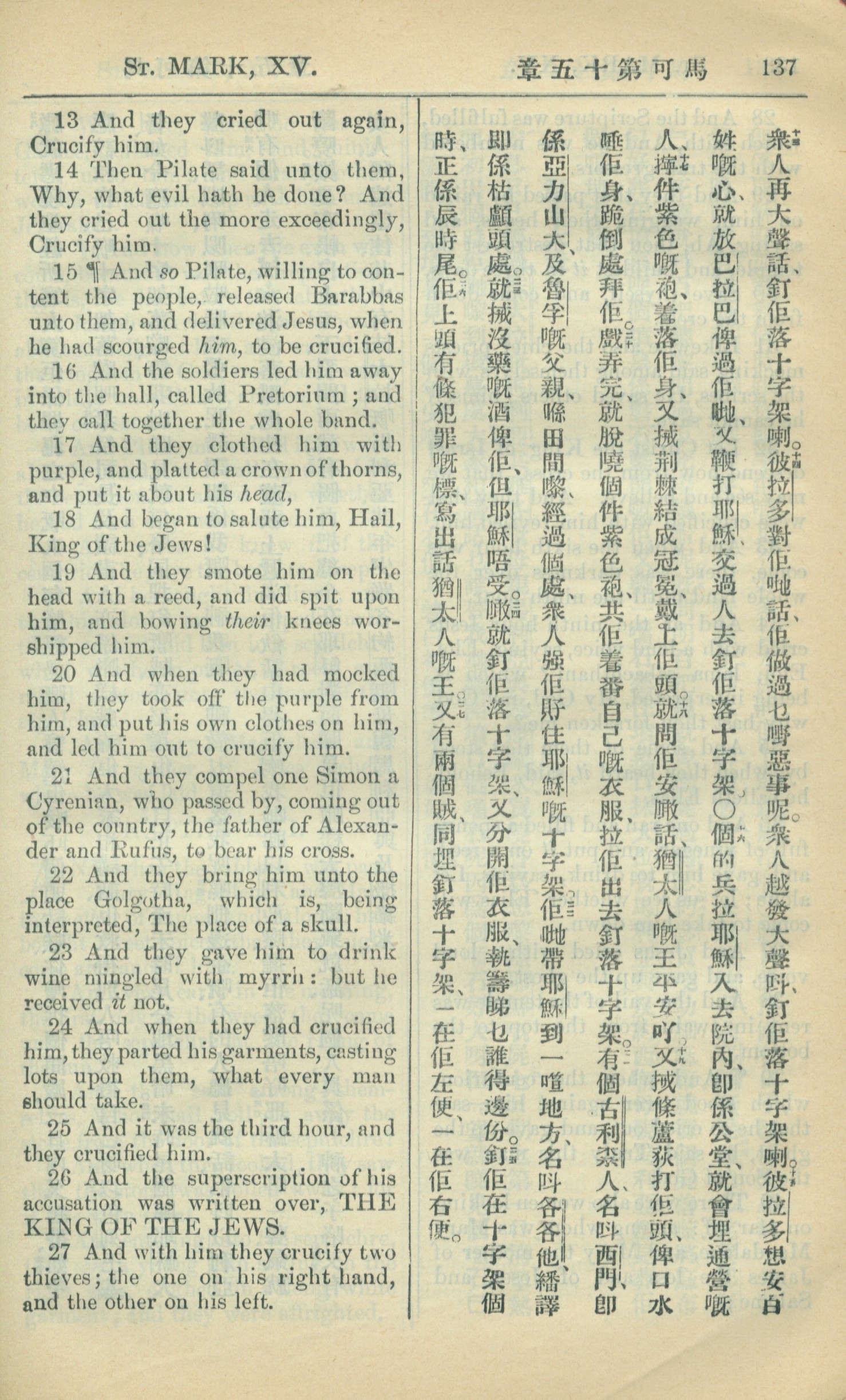 1909年中西字新约全书 马可福音 15 章 13 节到 15 章 27 节