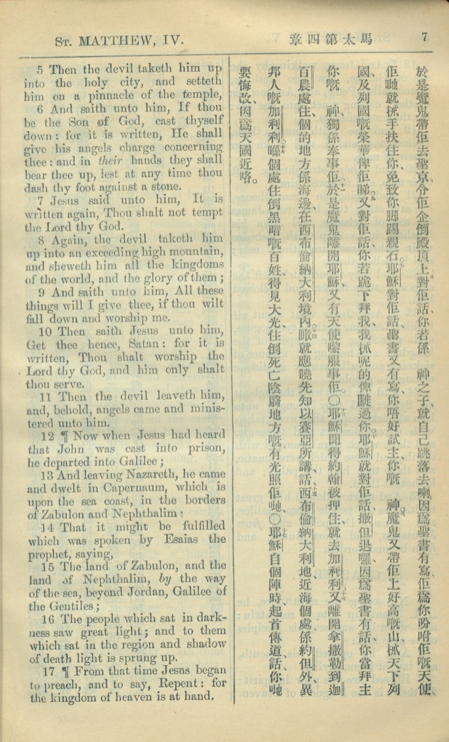 1909年中西字新约全书 马太福音 4 章 5 节到 4 章 17 节