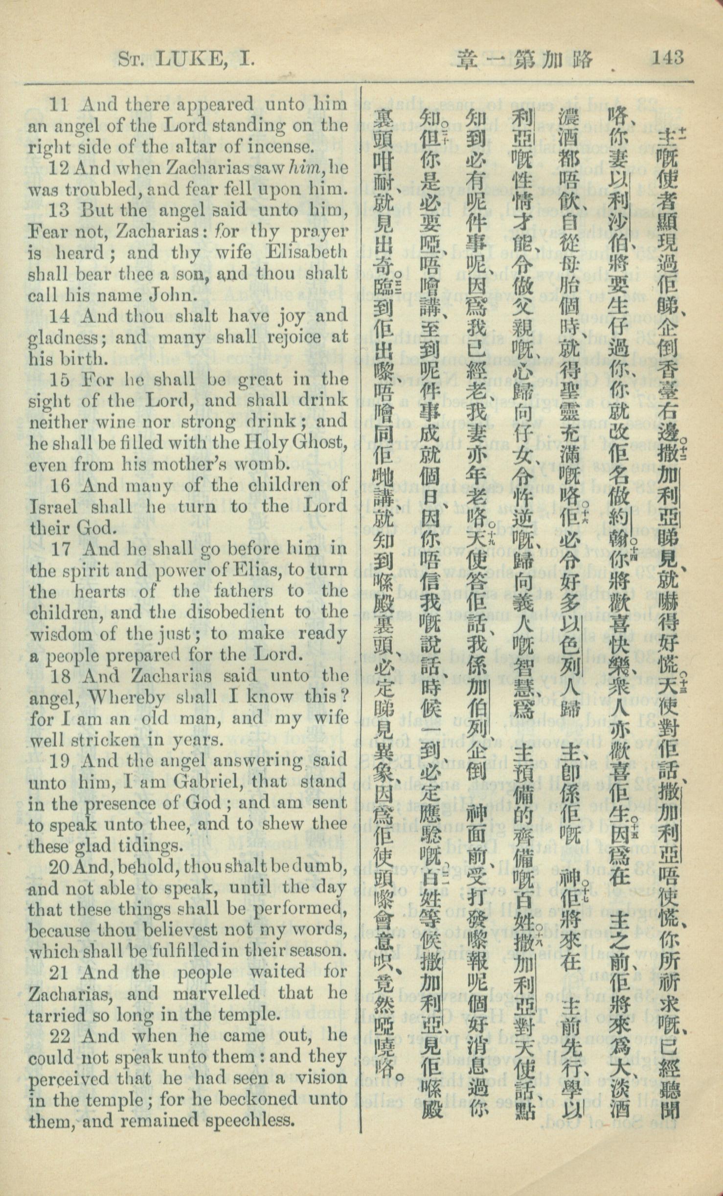 1909年中西字新约全书 路加福音 1 章 11 节到 1 章 22 节
