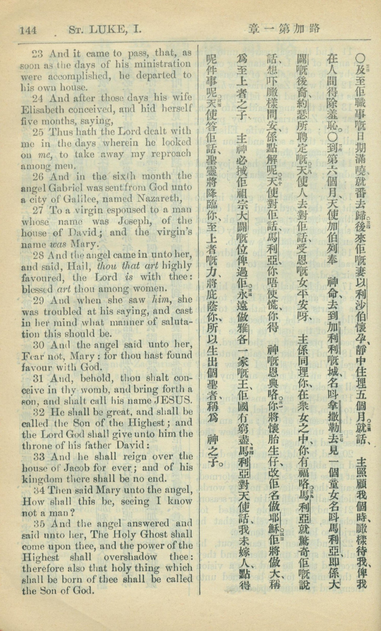 1909年中西字新约全书 路加福音 1 章 23 节到 1 章 35 节