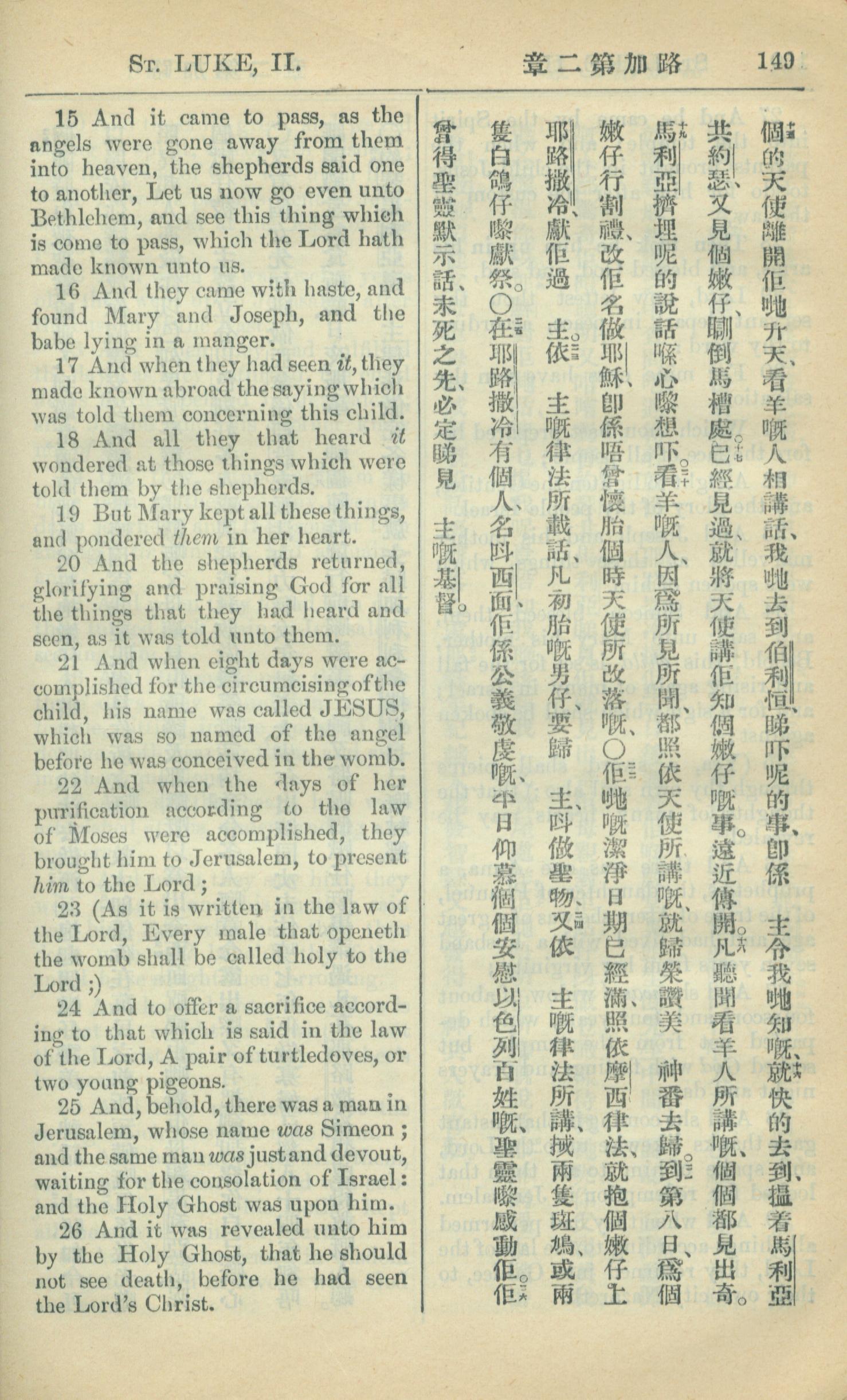 1909年中西字新约全书 路加福音 2 章 15 节到 2 章 26 节