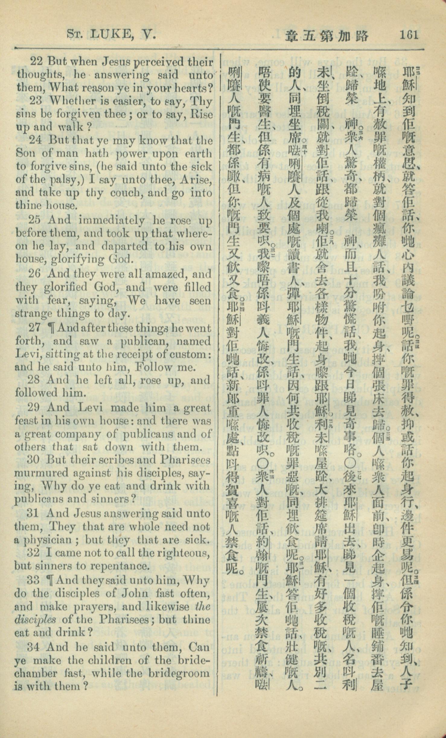 1909年中西字新约全书 路加福音 5 章 22 节到 5 章 34 节