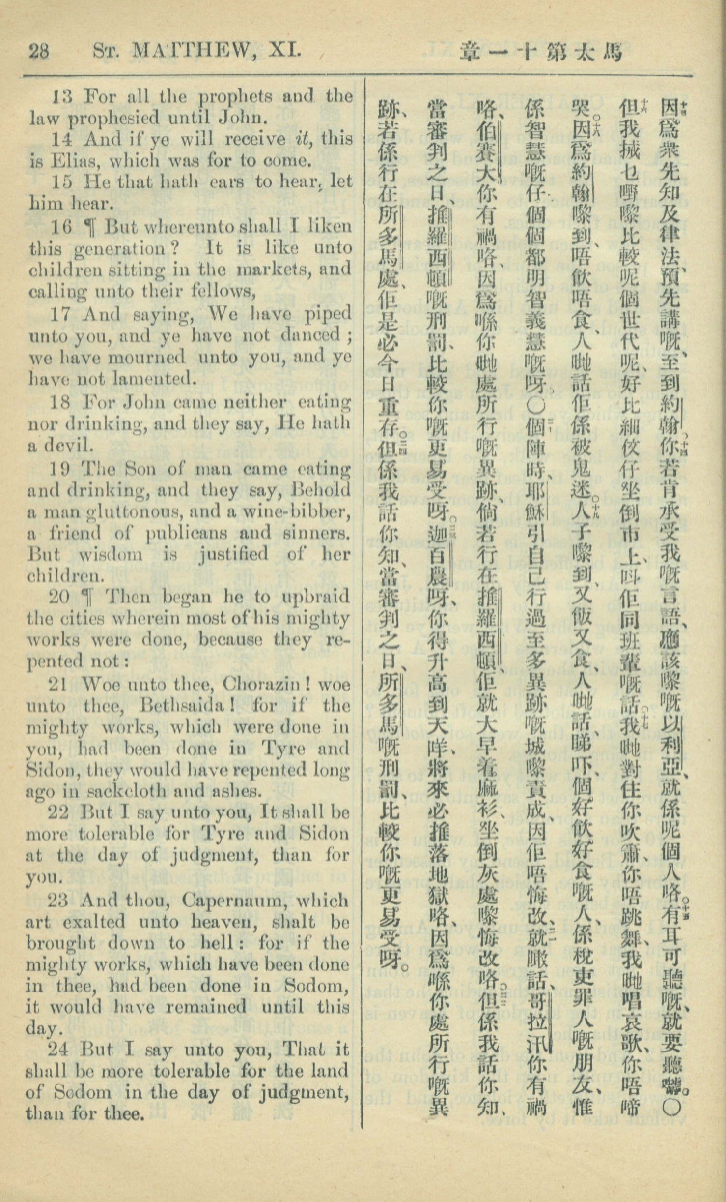 1909年中西字新约全书 马太福音 11 章 13 节到 11 章 24 节