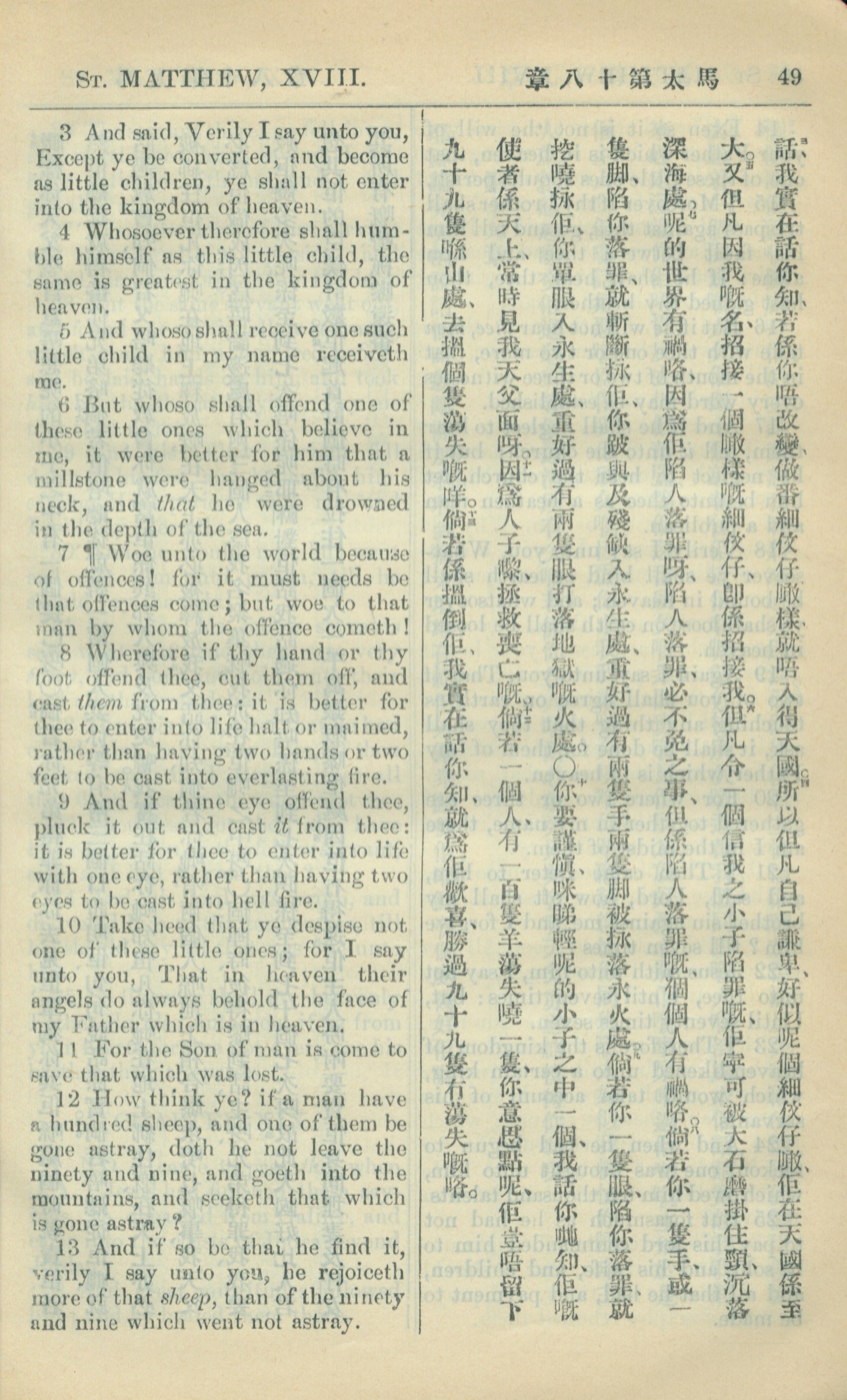 1909年中西字新约全书 马太福音 18 章 3 节到 18 章 13 节