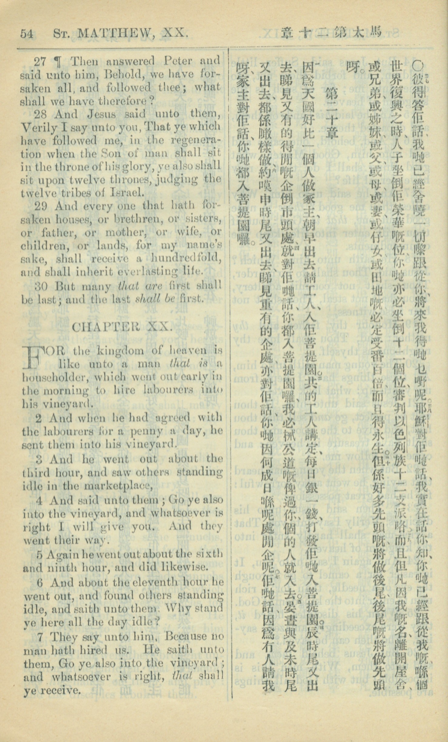 1909年中西字新约全书 马太福音 19 章 27 节到 20 章 7 节