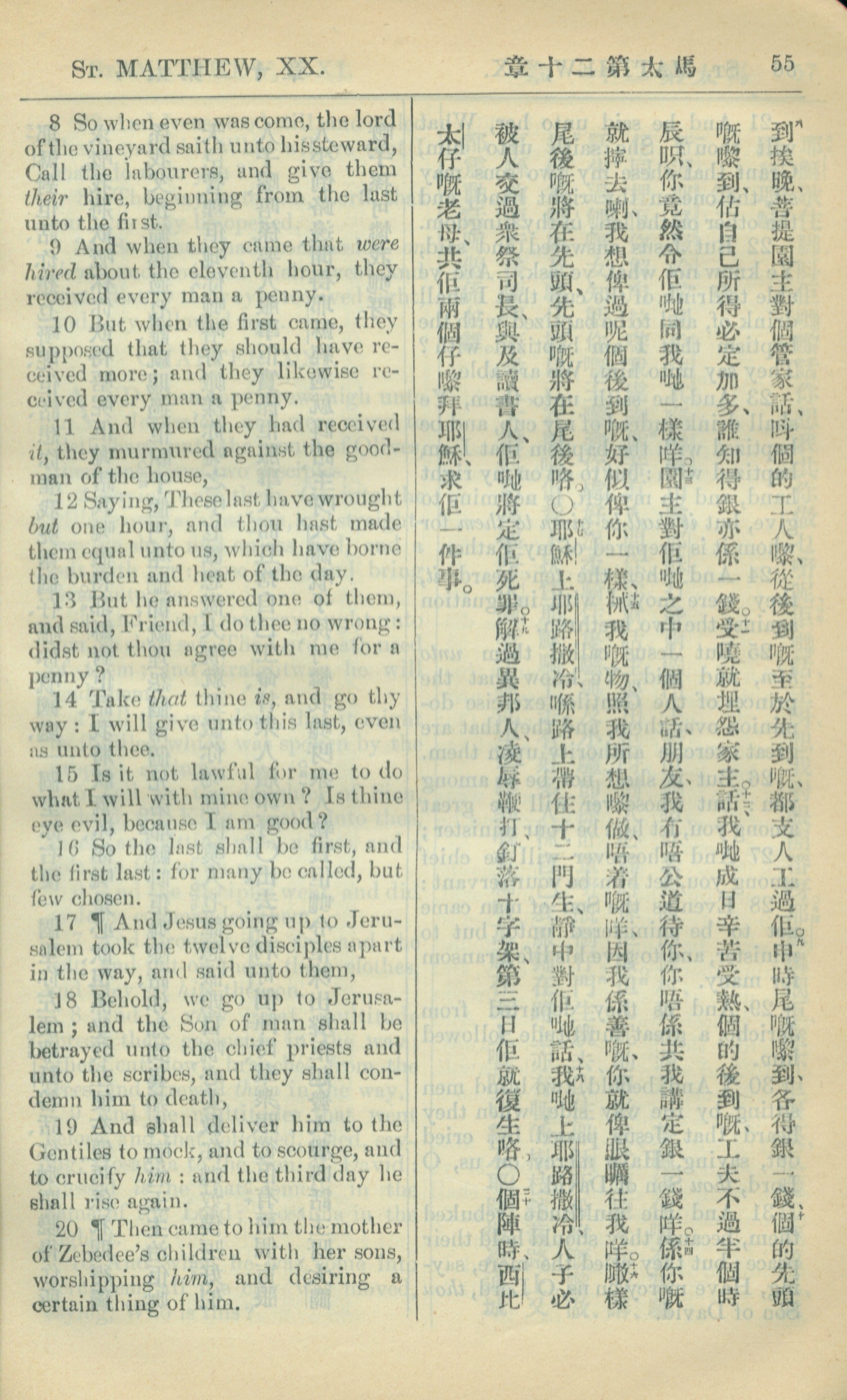 1909年中西字新约全书 马太福音 20 章 8 节到 20 章 20 节