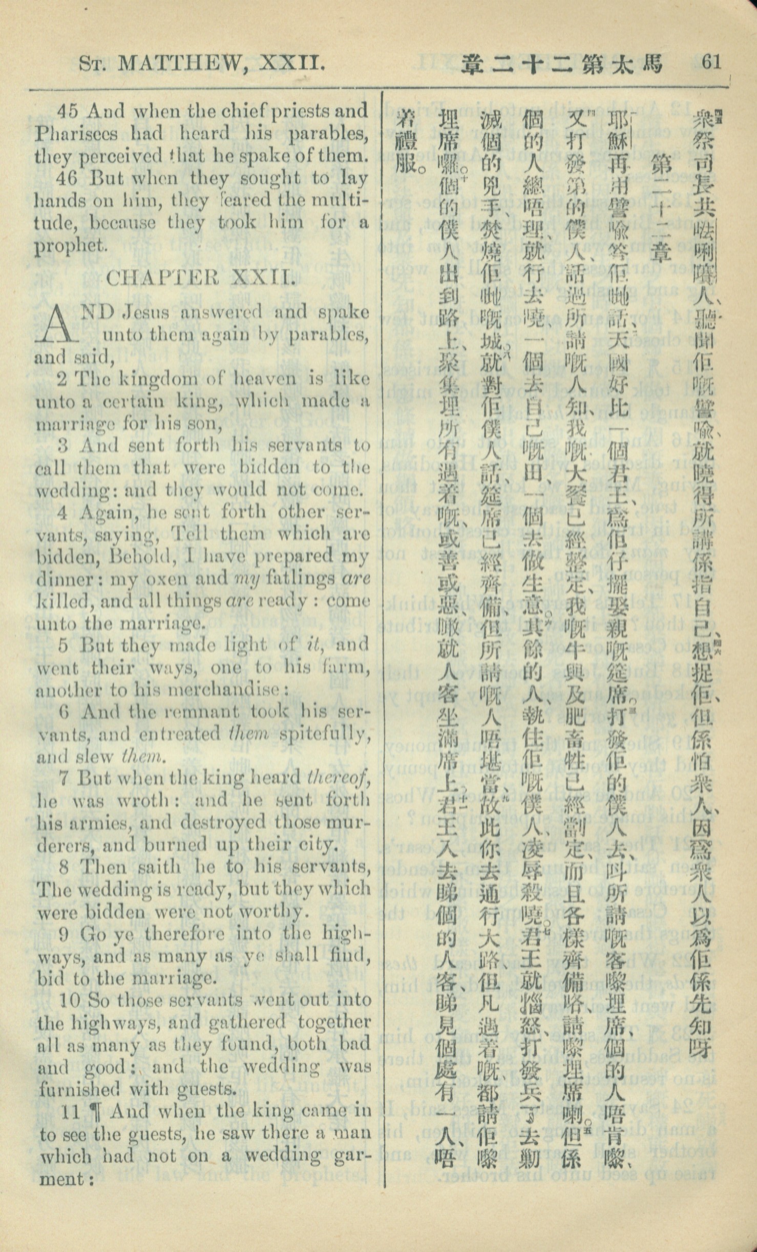1909年中西字新约全书 马太福音 21 章 45 节到 22 章 11 节