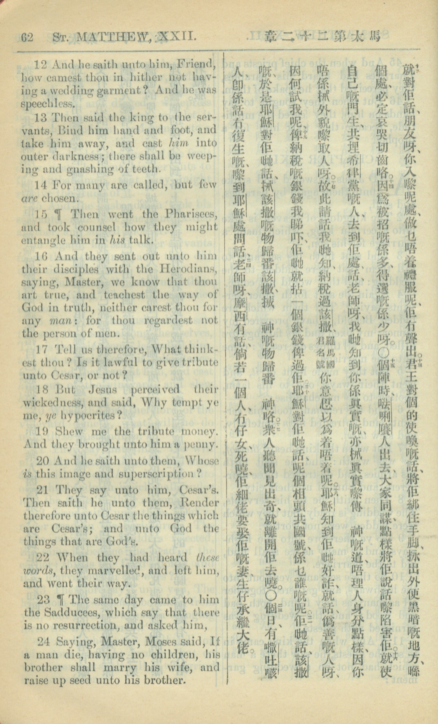 1909年中西字新约全书 马太福音 22 章 12 节到 22 章 24 节