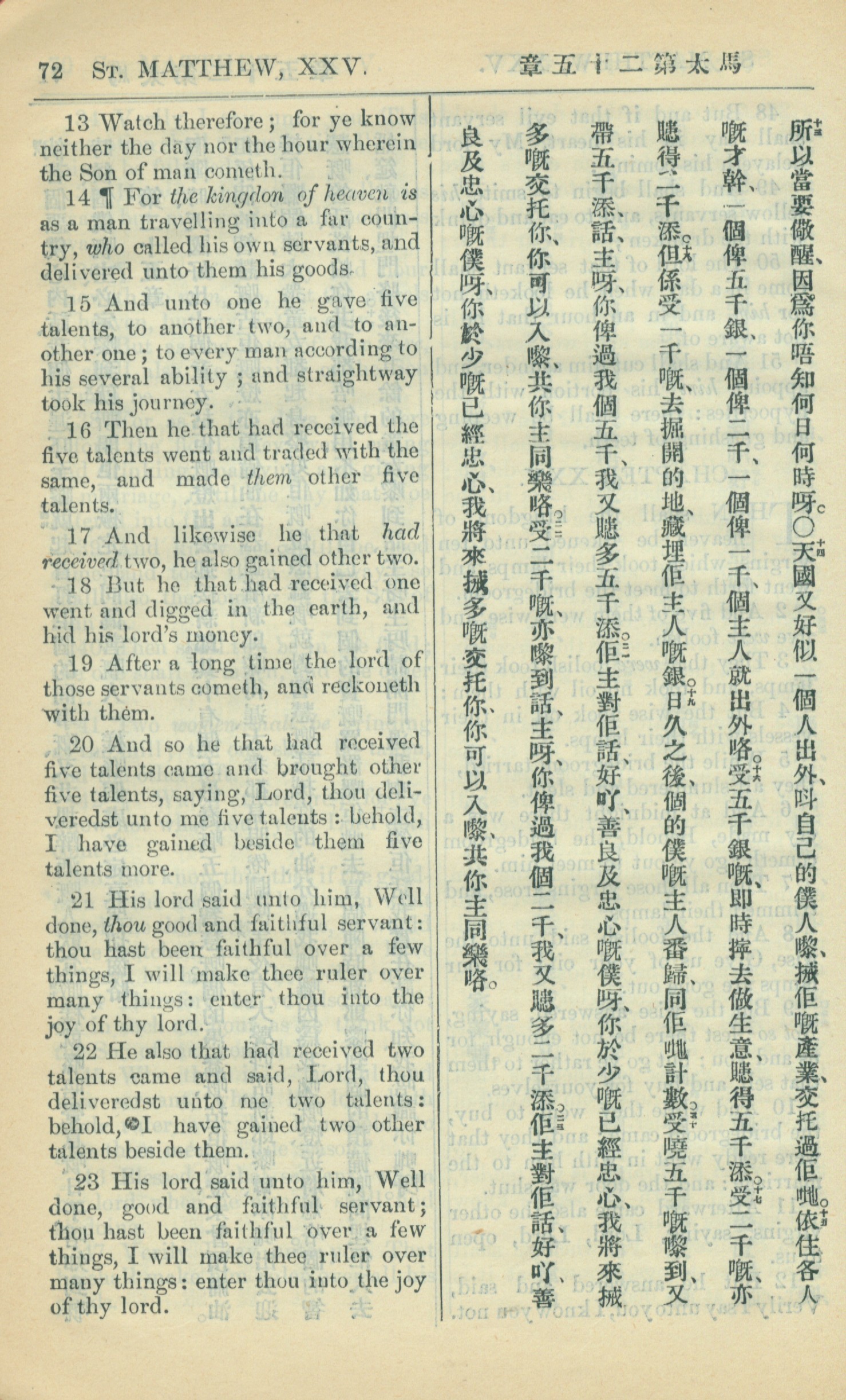 1909年中西字新约全书 马太福音 25 章 13 节到 25 章 23 节