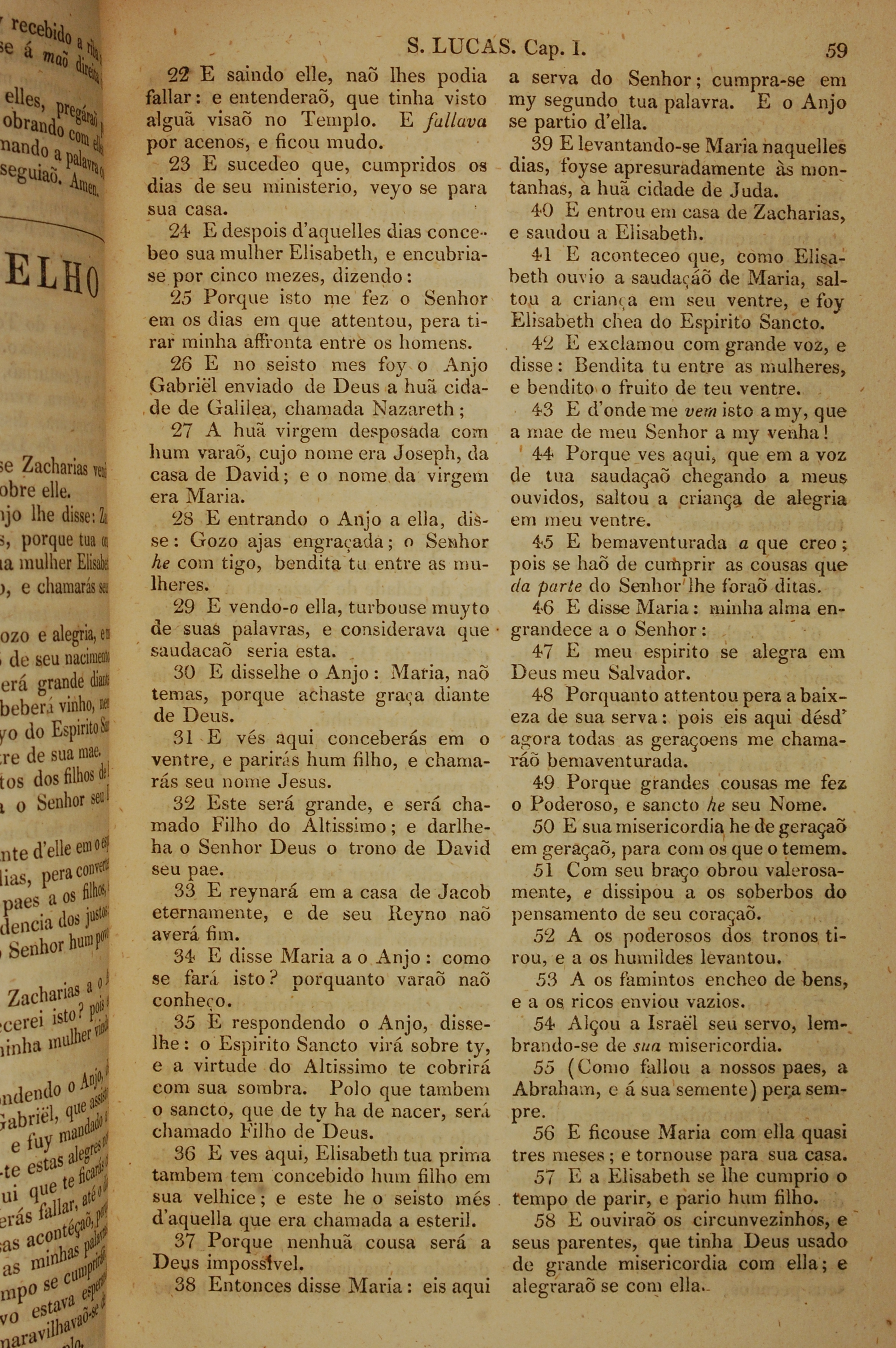 1819年葡萄牙语新约全书 路加福音 1 章 22 节到 1 章 58 节