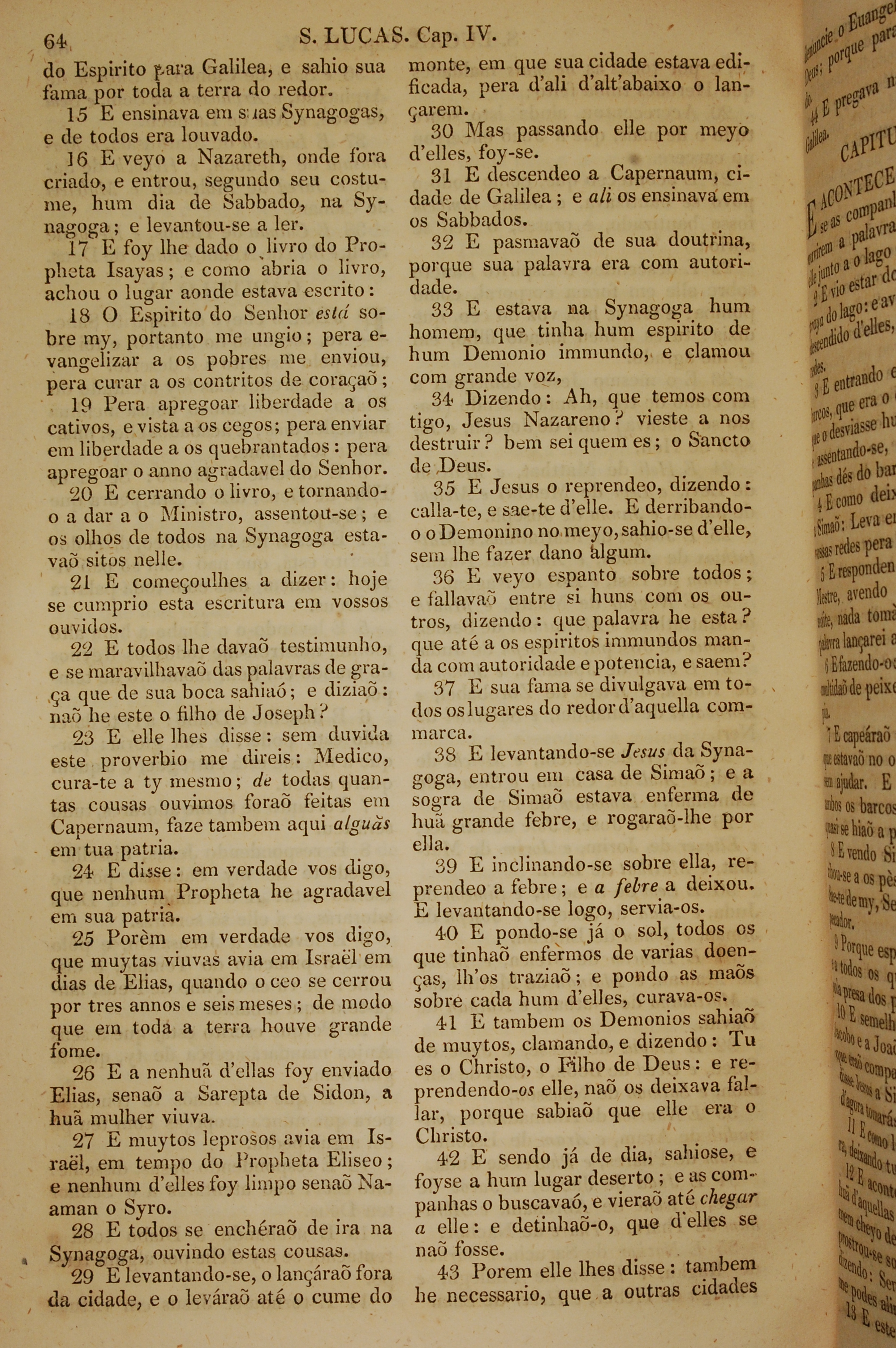 1819年葡萄牙语新约全书 路加福音 4 章 15 节到 4 章 43 节