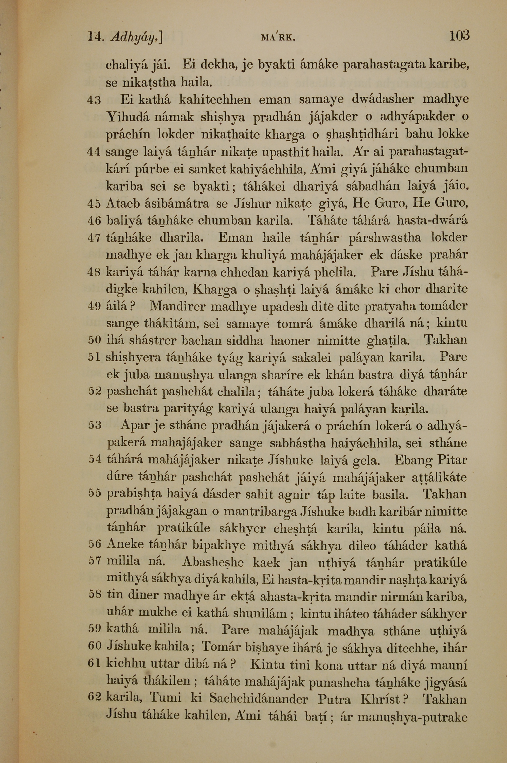 1839年孟加拉语新约全书 马可福音 14 章 43 节到 14 章 62 节