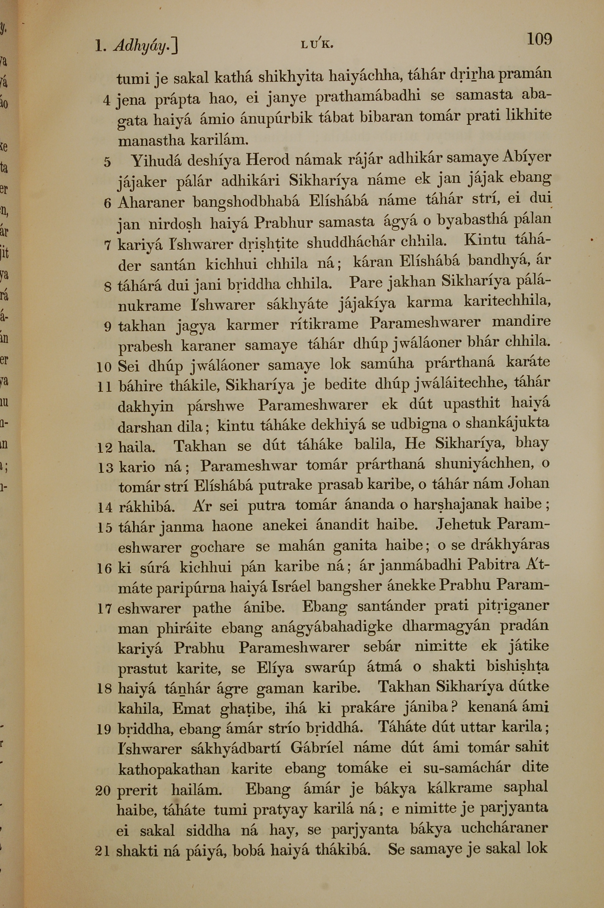 1839年孟加拉语新约全书 路加福音 1 章 4 节到 1 章 21 节