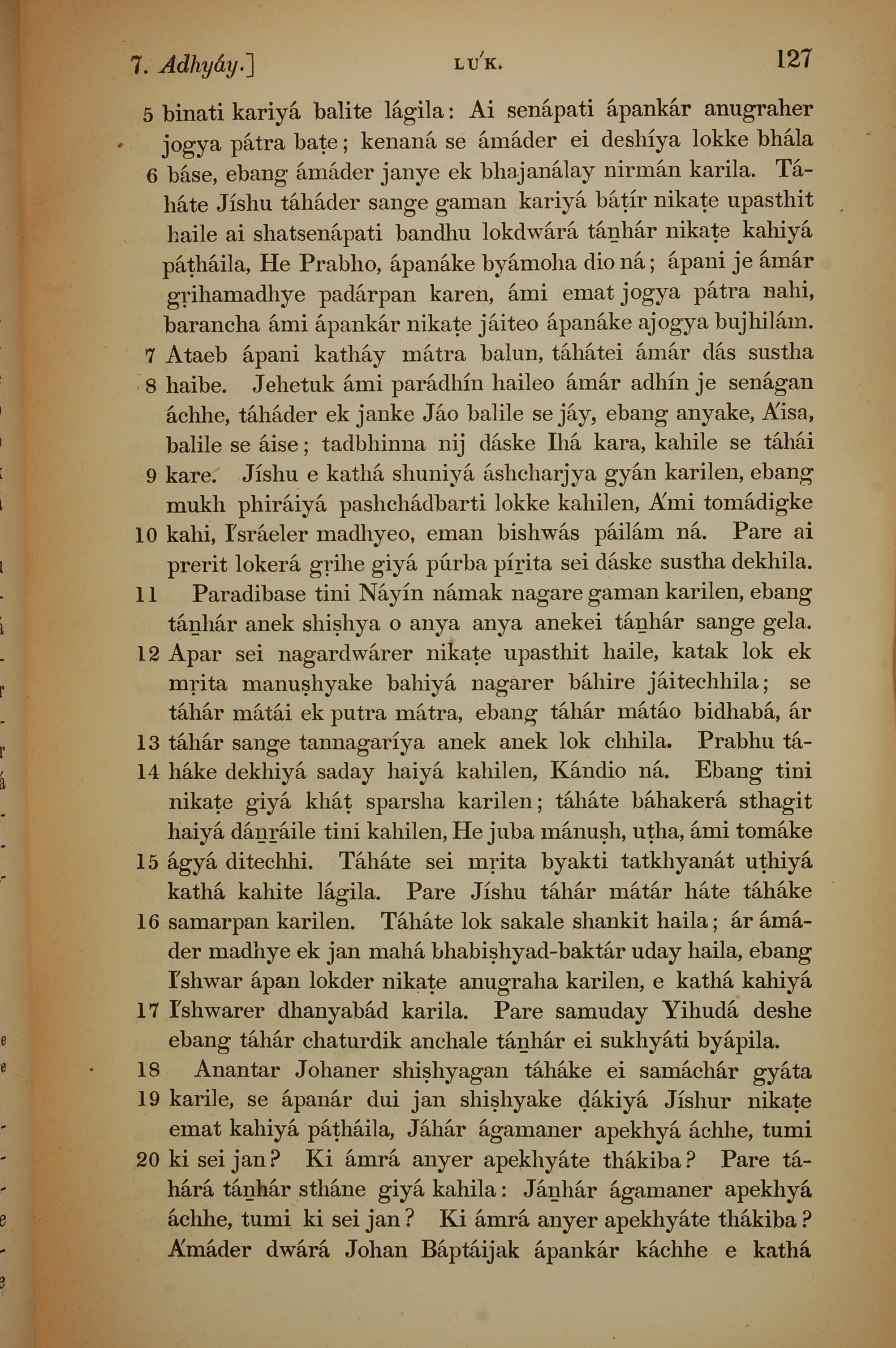 1839年孟加拉语新约全书 路加福音 7 章 5 节到 7 章 20 节