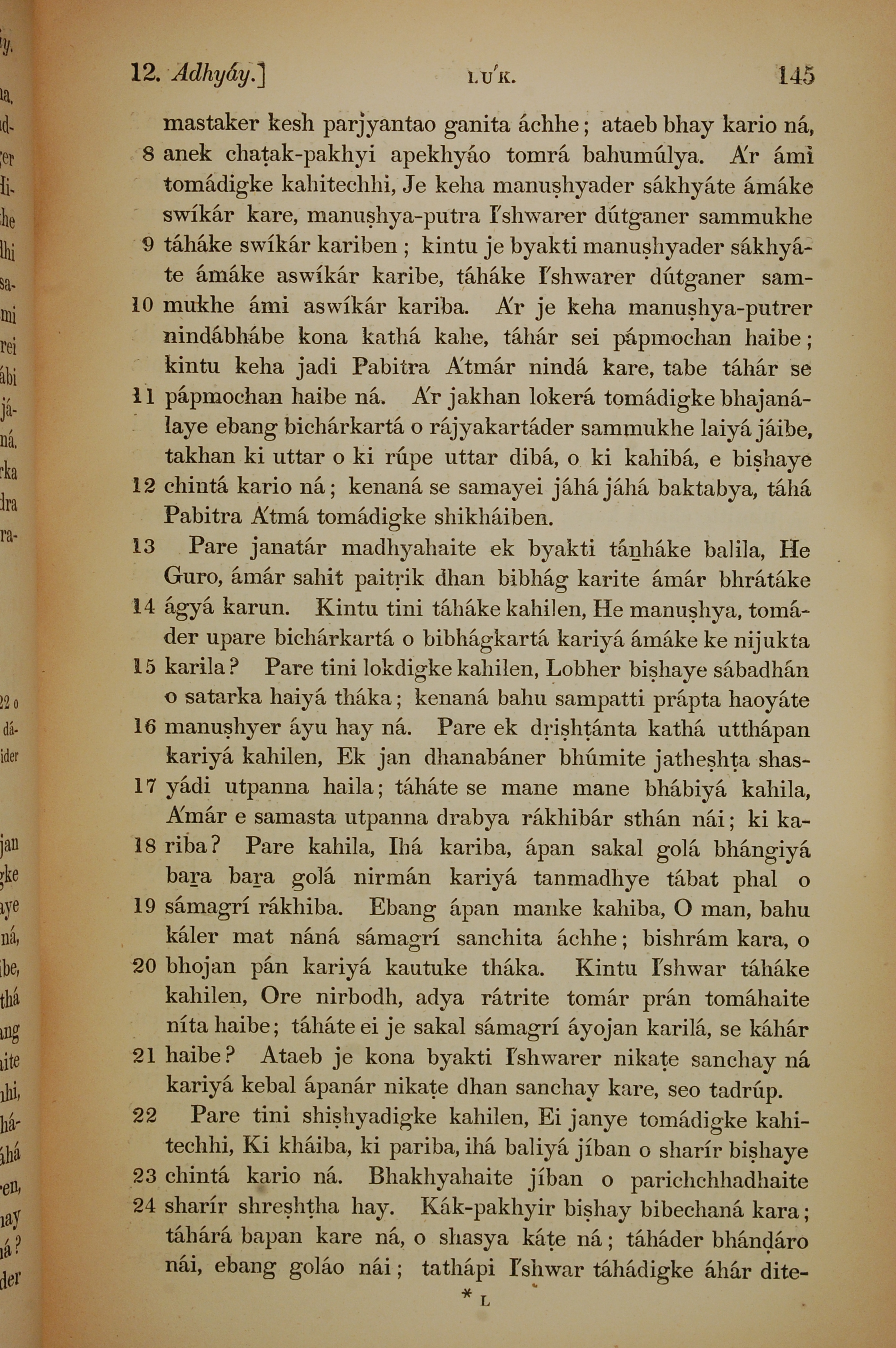 1839年孟加拉语新约全书 路加福音 12 章 8 节到 12 章 24 节