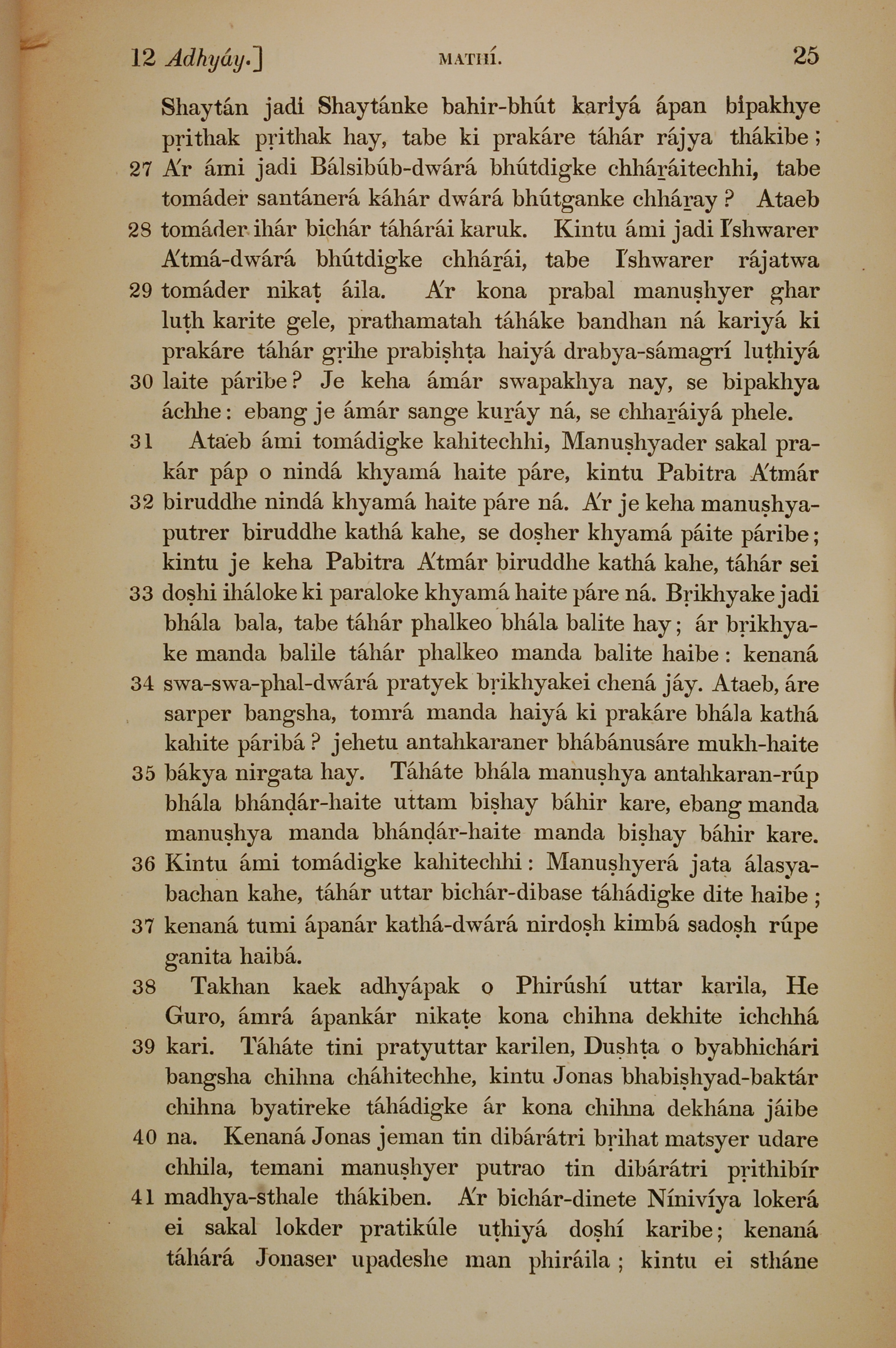 1839年孟加拉语新约全书 马太福音 12 章 27 节到 12 章 41 节