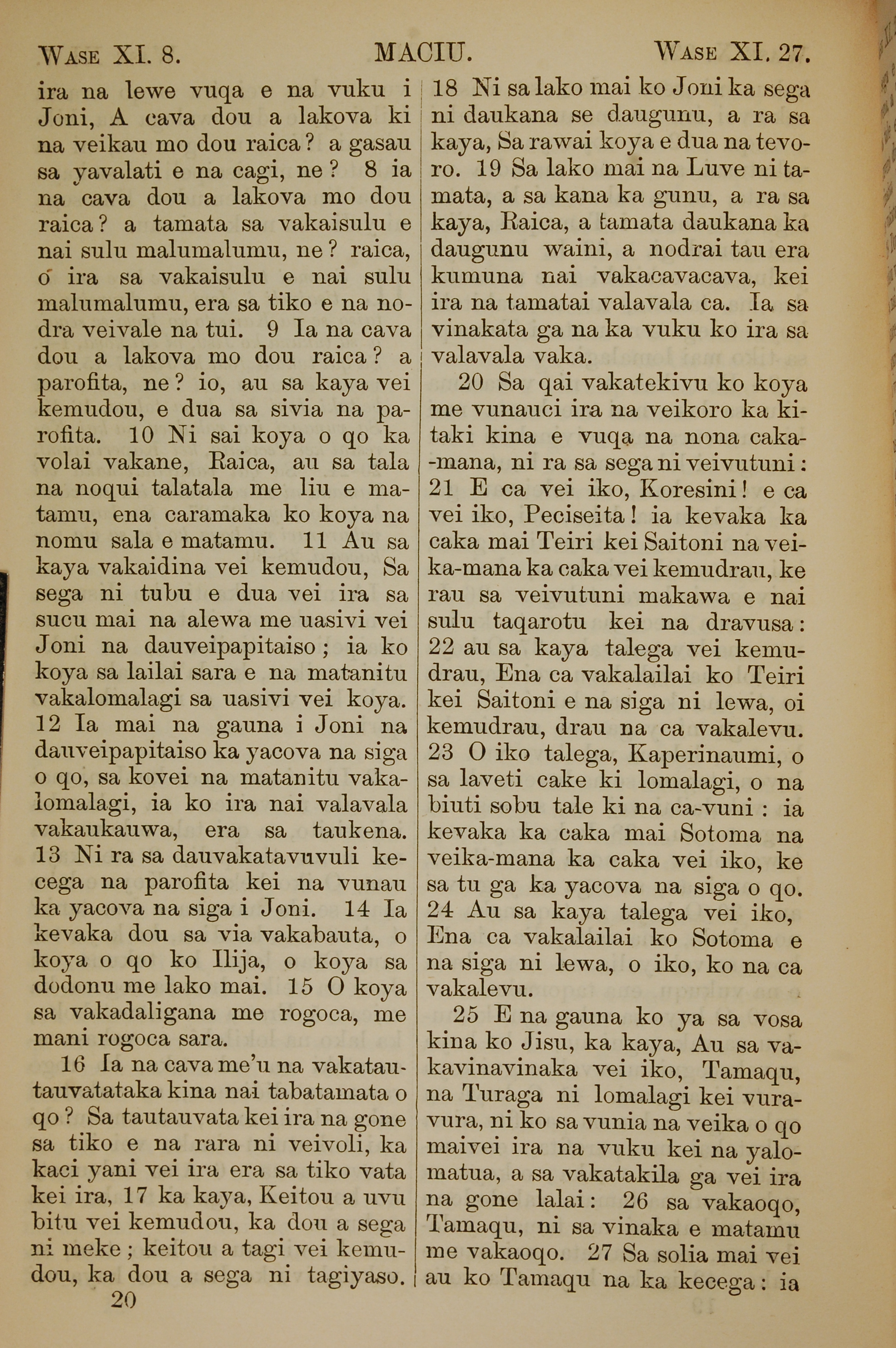 1858年斐济文新约全书 马太福音 11 章 8 节到 11 章 27 节