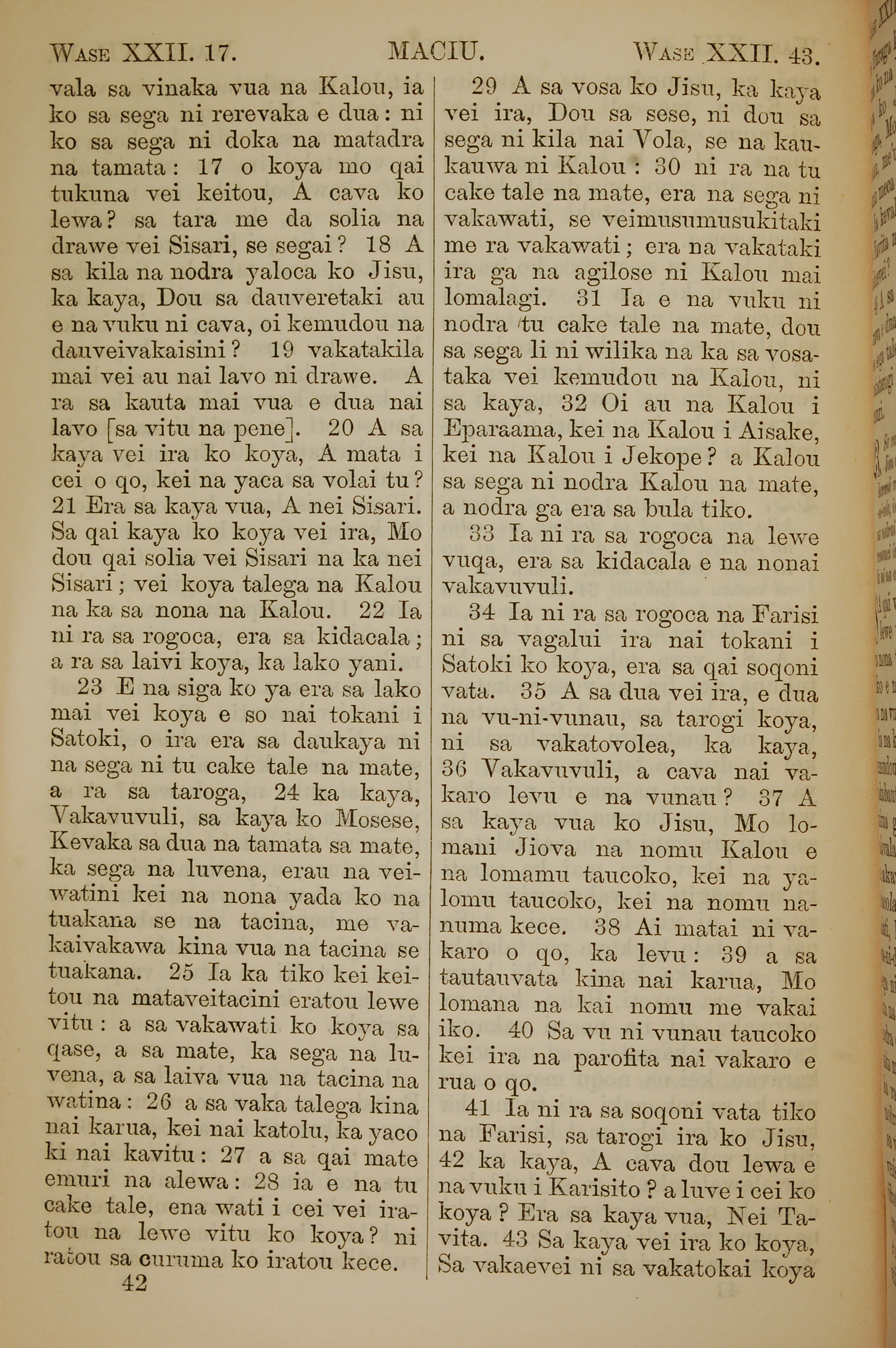 1858年斐济文新约全书 马太福音 22 章 17 节到 22 章 43 节