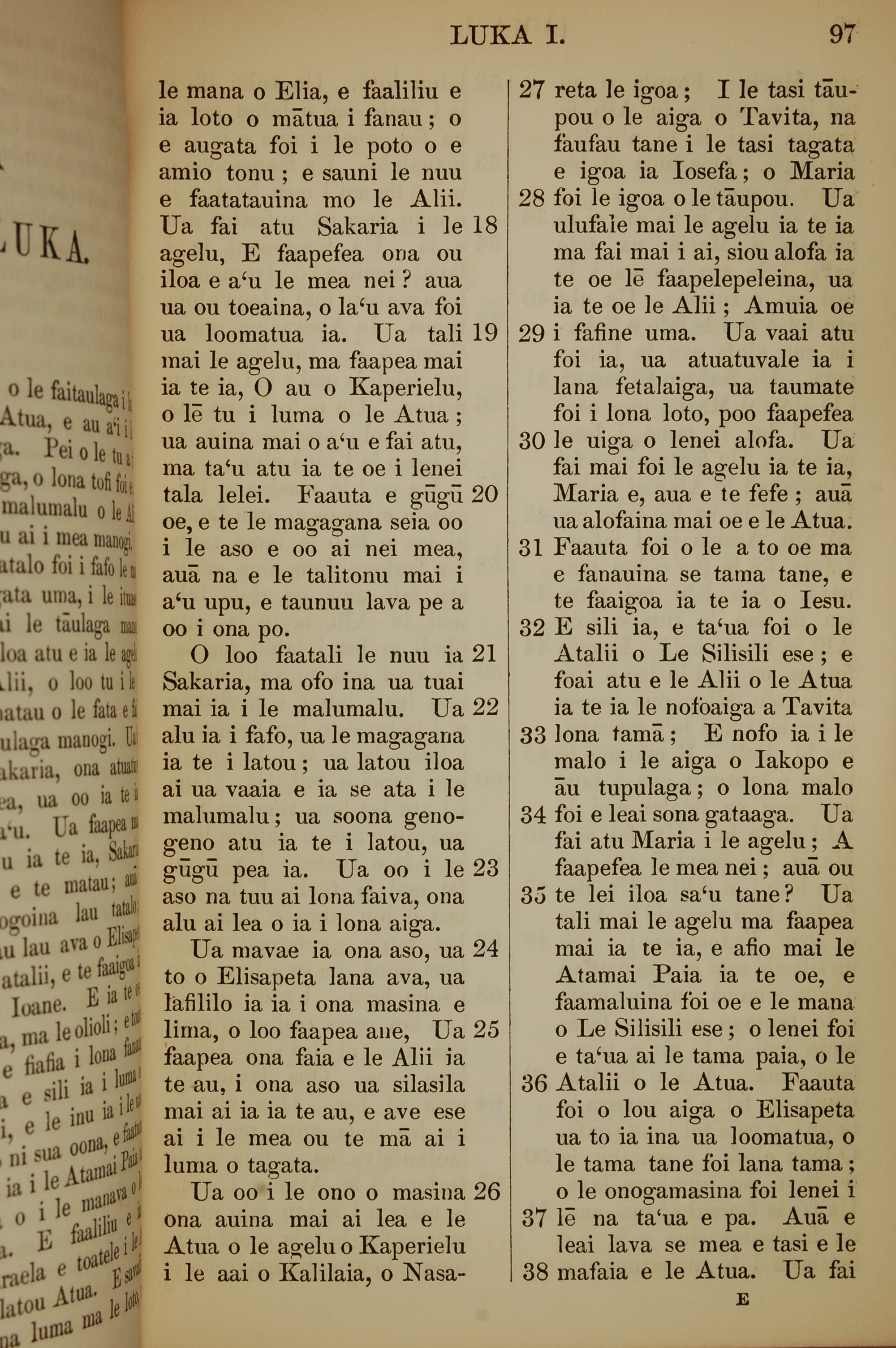 1849年萨摩亚语新约全书 路加福音 1 章 18 节到 1 章 38 节