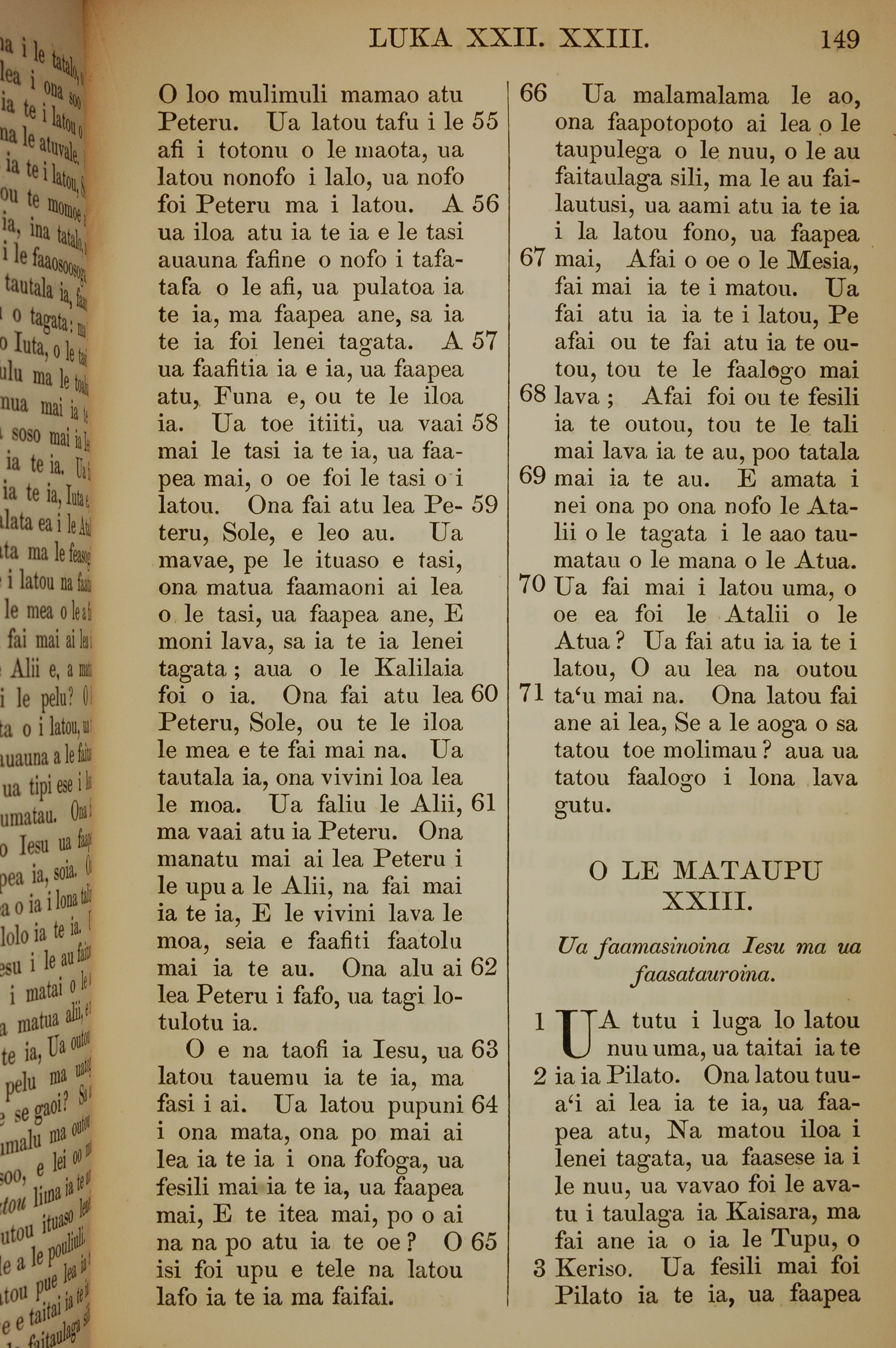 1849年萨摩亚语新约全书 路加福音 22 章 55 节到 23 章 3 节