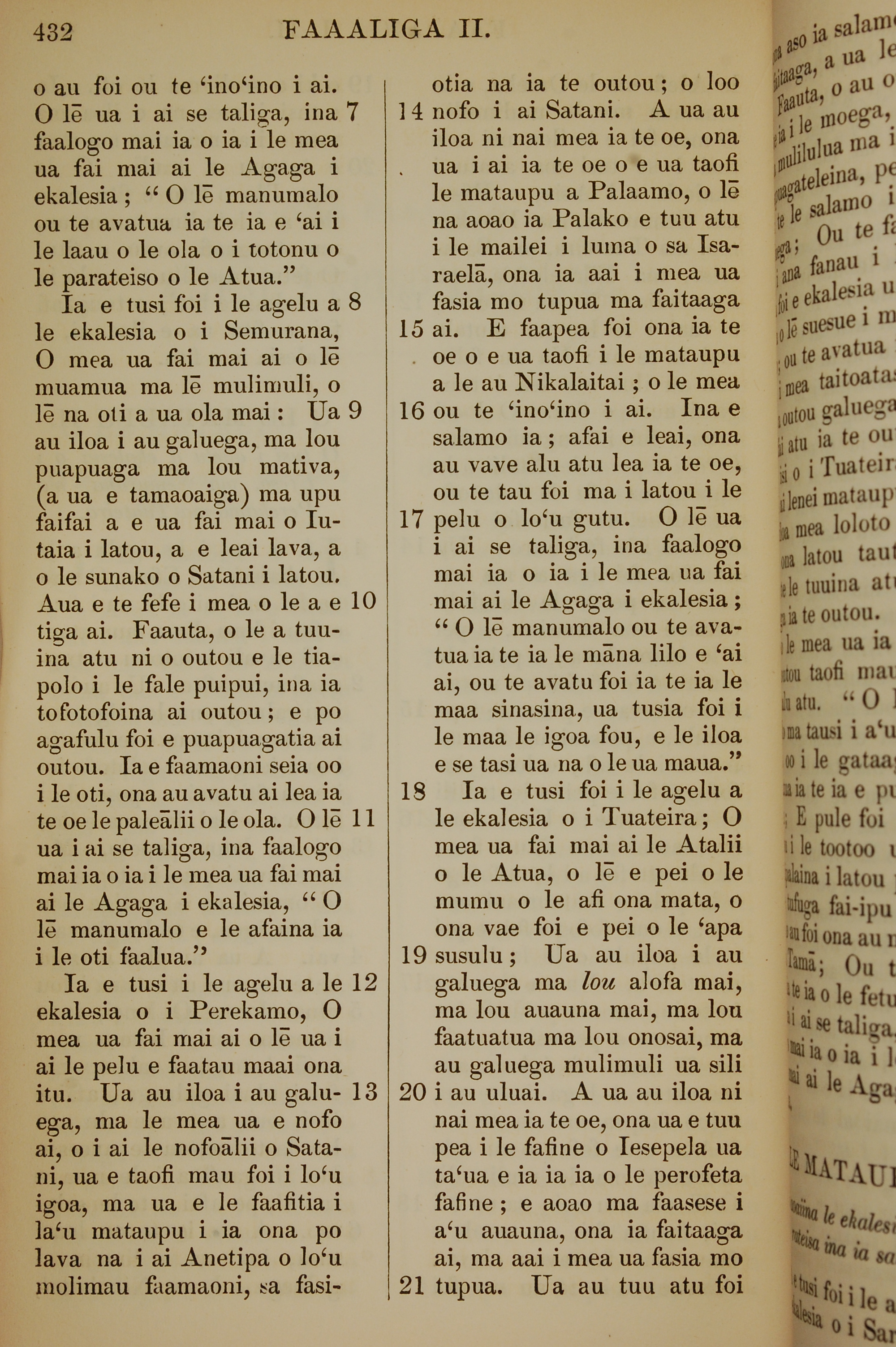 1849年萨摩亚语新约全书 启示录 2 章 7 节到 2 章 21 节