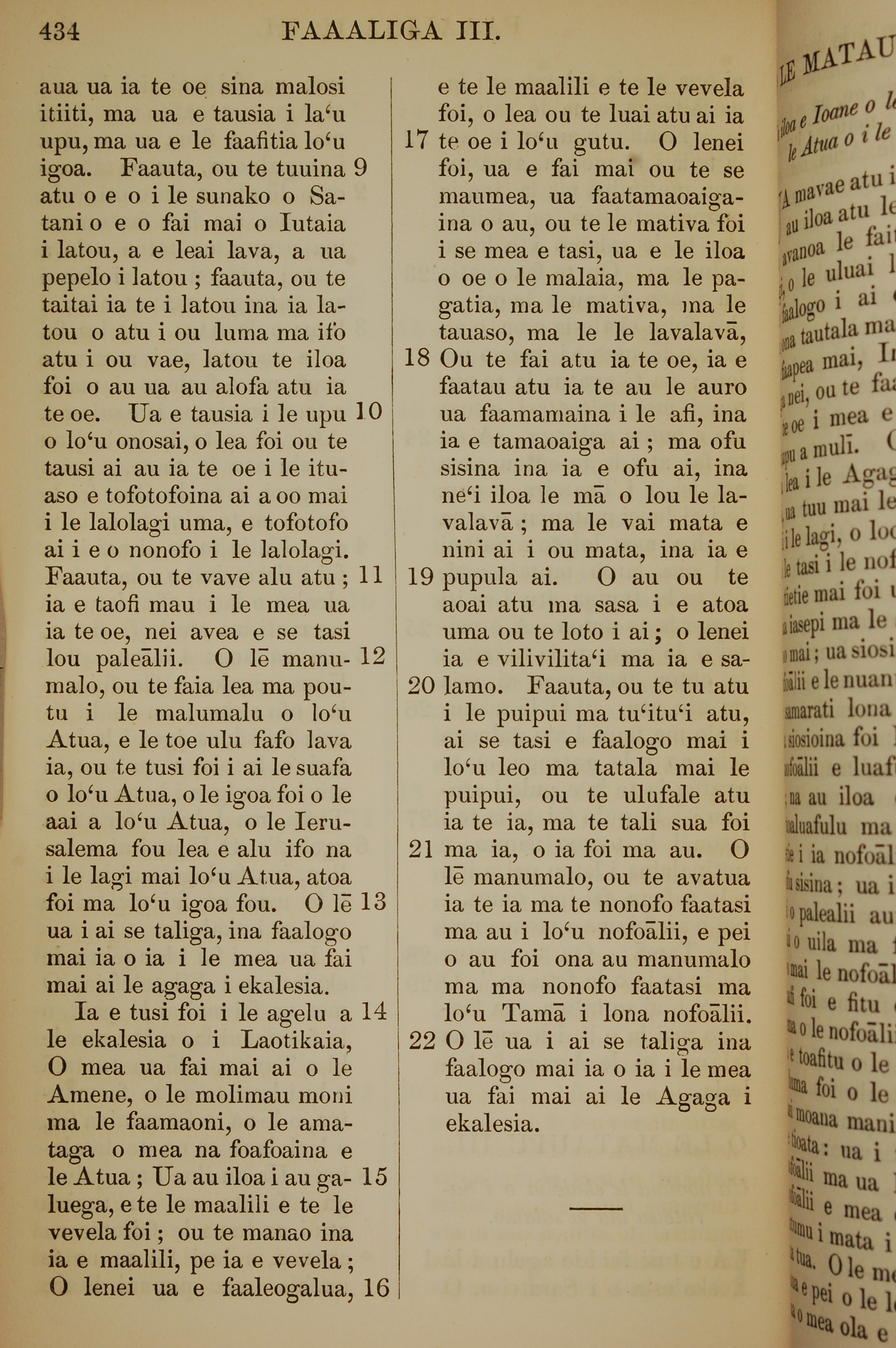 1849年萨摩亚语新约全书 启示录 3 章 9 节到 3 章 22 节