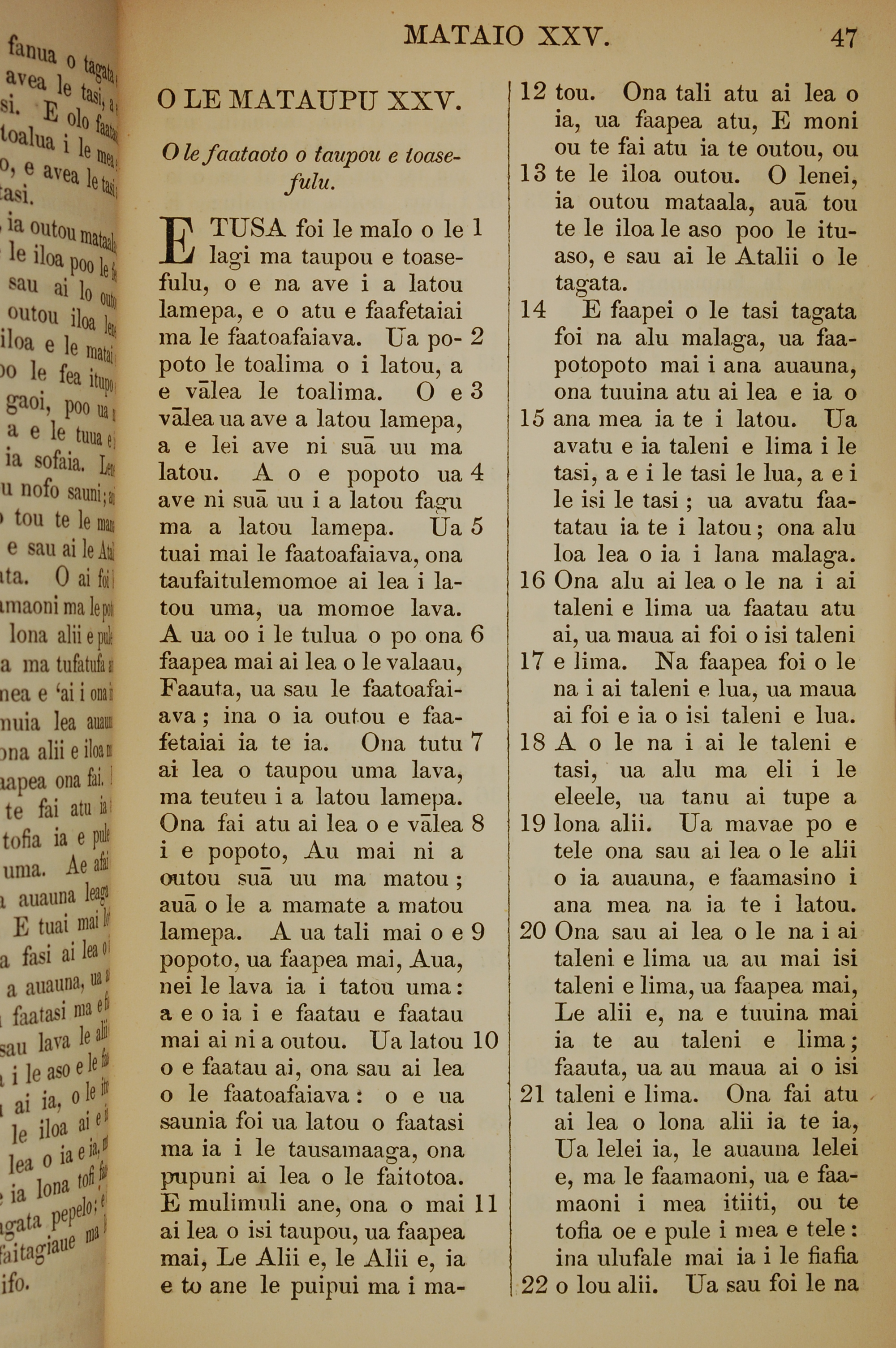 1849年萨摩亚语新约全书 马太福音 25 章 1 节到 25 章 22 节