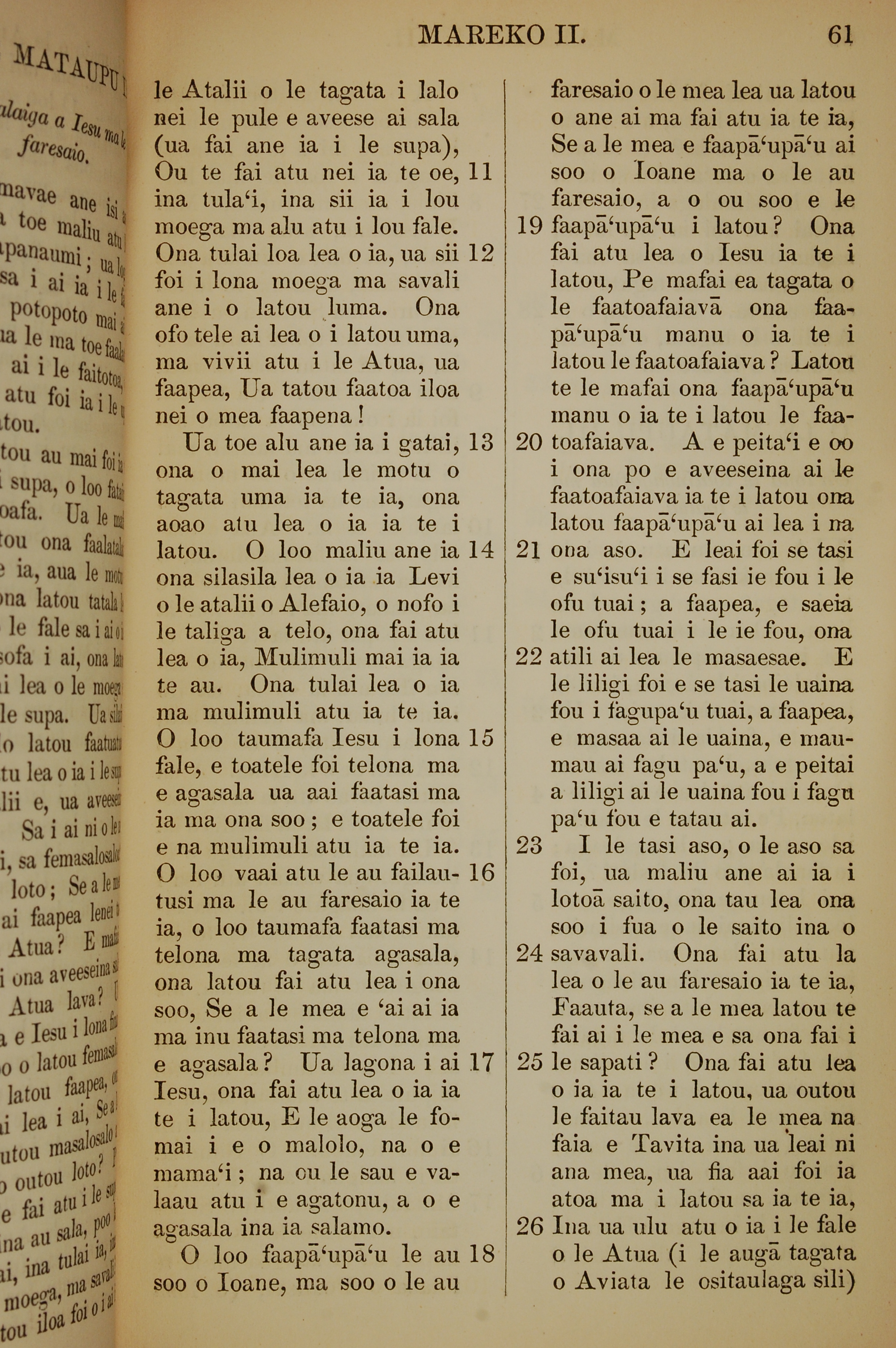 1849年萨摩亚语新约全书 马可福音 2 章 11 节到 2 章 26 节