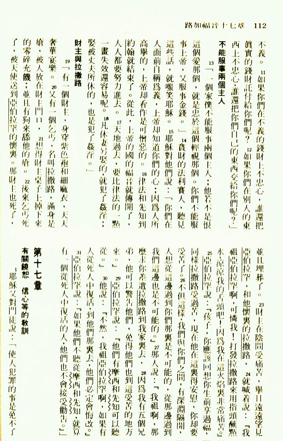 1976年圣经新译本新约 路加福音 16 章 11 节到 17 章 1 节