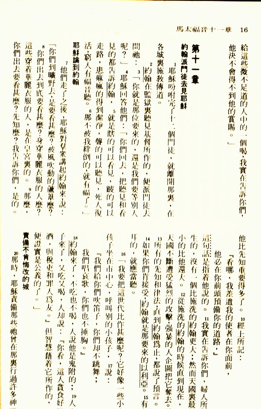 1976年圣经新译本新约 马太福音 11 章 1 节到 11 章 20 节